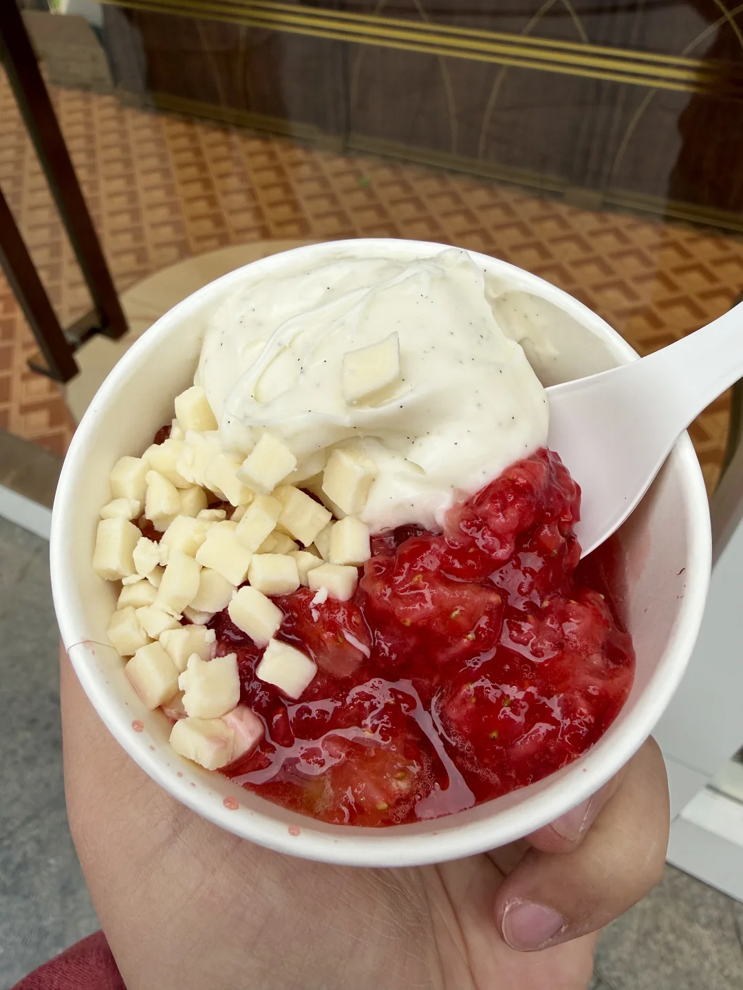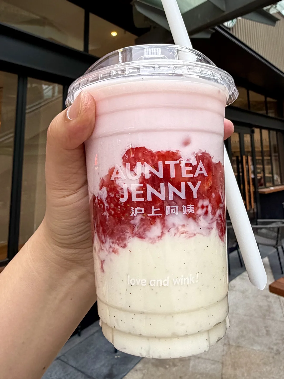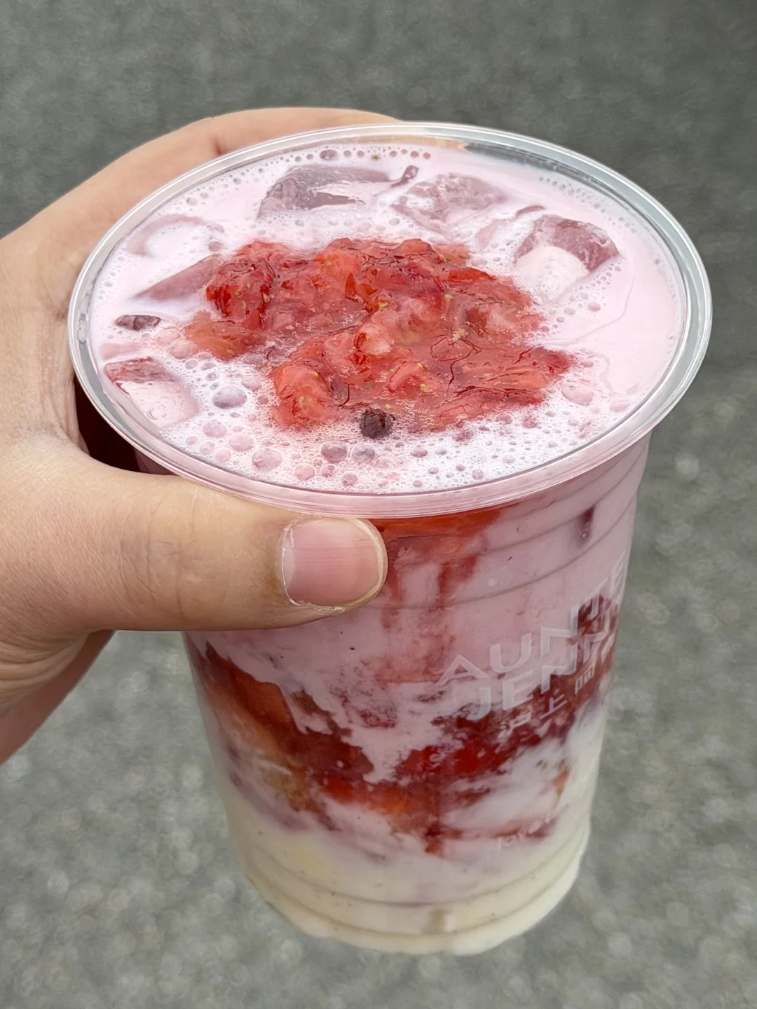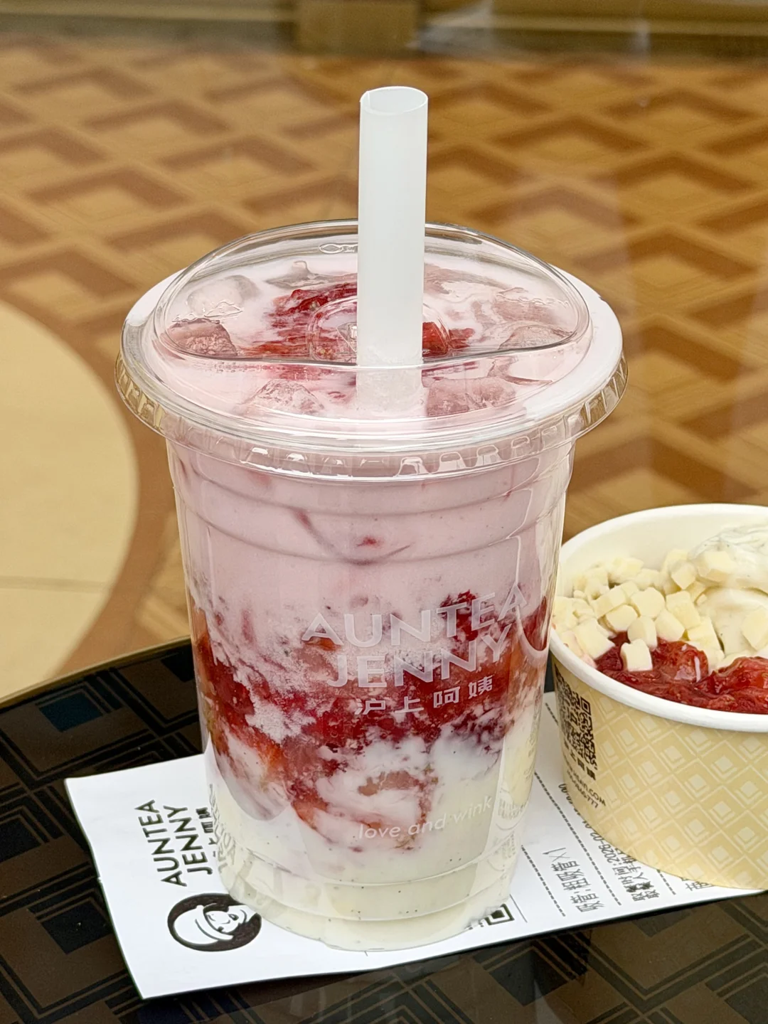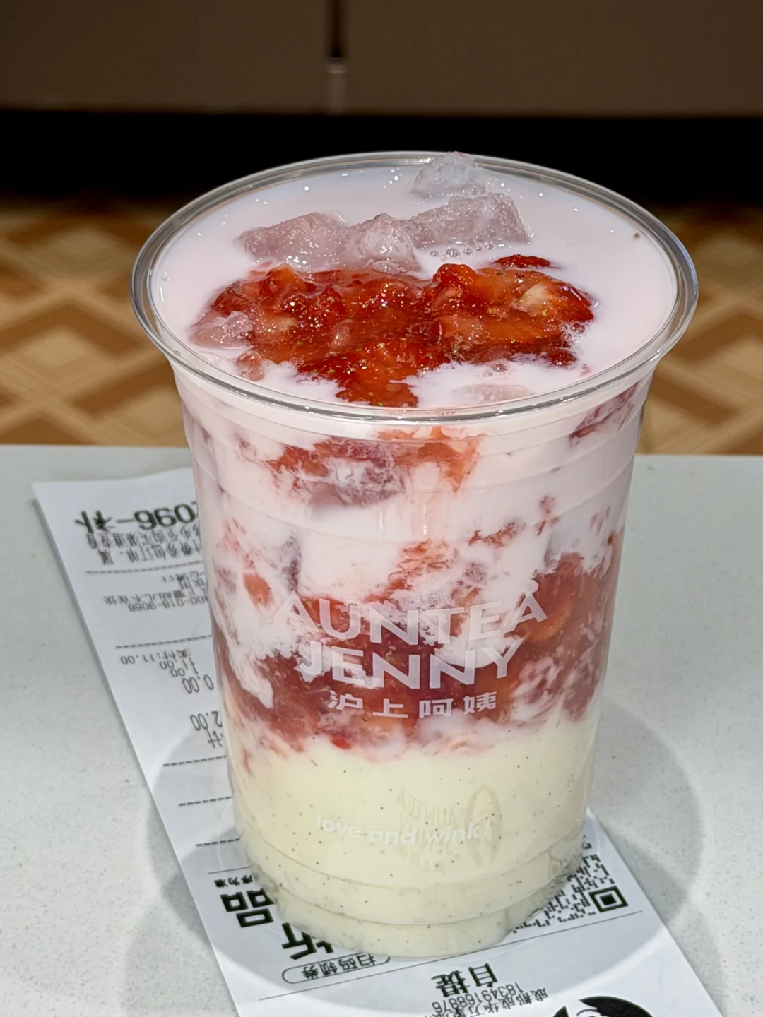 目前喝到最夯的一杯草莓奶茶!!婶子的这杯草莓香草芝士干酪我要喝一整年!!草莓脑袋和干酪脑袋的双重满足谁懂啊。。。。 里面加了新的香草籽乳酪小料,底部看到很明显的香草籽,一口下去可以同时吃到芝士丁和酸甜的草莓果肉🍓果香、奶香和茶香融合得非常奈斯!! 干酪和芝士丁非常醇厚,每一口都很扎实😋(喜欢咀嚼感的,超级推荐加一份黑糖波波,边嚼边喝超级满足!!)这一杯下去简直就像是在吃液体版的草莓流心巴斯克!!
