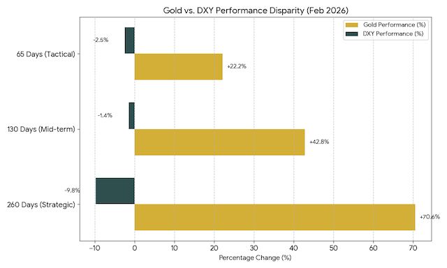 根据BCAResearch的计算方法,在一个完整的年度交易周期内,美元指数从107.96回落至97.42,跌幅仅为9.76%;而同期金价却从每盎司2875美元飙升至2月3日的4905美元,涨幅超过70%。若以半年为观察窗口,这一背离更为显著,美元指数微跌1.38%,金价却暴涨42.84%,两者变动倍数比达到31倍。