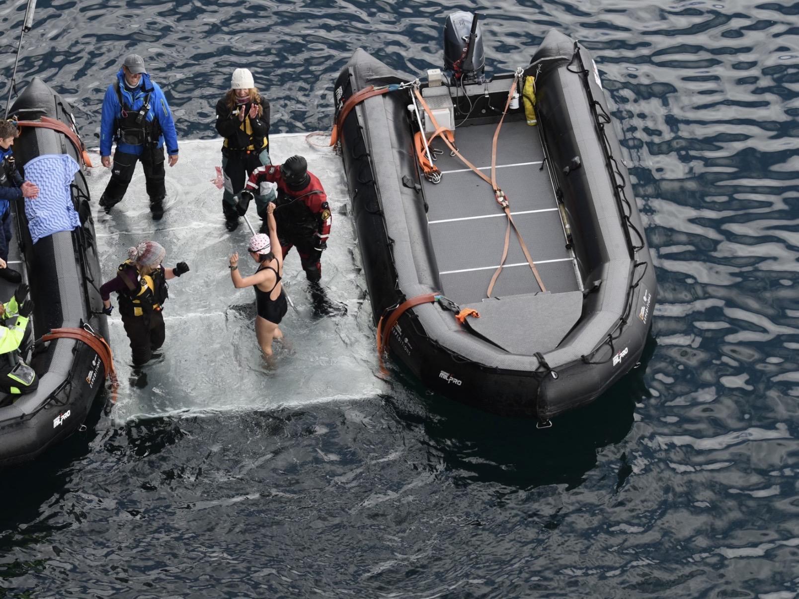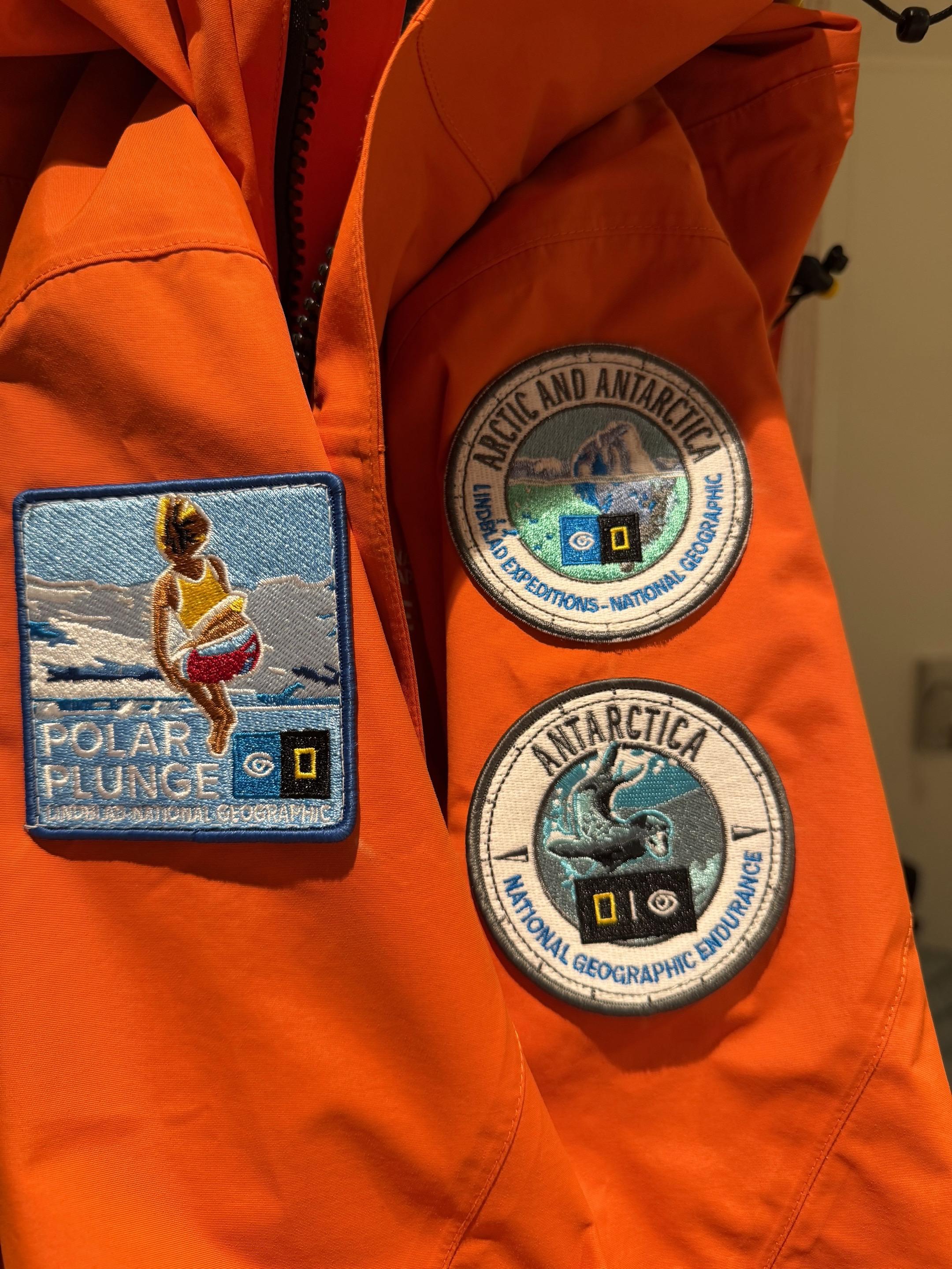 我在南极跳水啦! 🇦🇶Polar Plunge! 在南极跳水,水温1度,排队的时候我就冻僵了,跳下去的一刻兴奋到起飞,上岸后脚冻麻了人热乎,船员给我一杯威士忌庆祝🥃,辣到变形🫠,收获一枚新徽章!已经缝在衣服上了哈哈哈哈哈