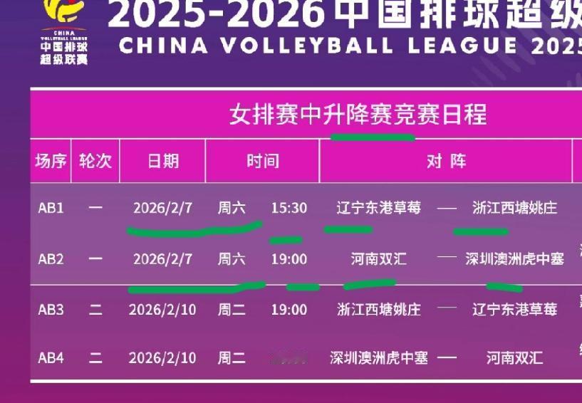 周六赛程: 升降赛开打!河南对阵深圳 辽宁对阵浙江! 排超联赛常规赛最后一轮比赛昨天晚上全部结束。最终河南女排和辽宁女排排名排超联赛常规赛第七名和第八名。辽宁女排和河南女排参加本周六的升降级比赛! 本周六排超联赛升降级比赛继续进行。具体赛程如下。本周六下午三点半,升降级比赛第一场比赛,辽宁女排主场作战对阵浙江女排。这也是两支队伍新赛季排超联赛的第一次交手比赛。 辽宁女排双外援配置,还有北京女排和山东女排加盟的队员。浙江女排全华班出战。第一回合辽宁女排主场作战。 第二场比赛周六晚上七点开始,河南女排对阵深圳女排。这也是河南女排和深圳女排在本赛季的第一次交手比赛。升降级比赛第一回合比赛,河南女排主场作战对阵深圳女排。 河南女排双外援加盟,深圳女排同样有双外援加盟,还有天津女排上海女排和广东女排的队员加盟。 本周六排超联赛升降级比赛的第一回合比赛开打。下周二晚上主客场对换再进行第二回合比赛。两场比赛的最终胜利者升级进入A级比赛,失败队伍降级B级比赛。天涯体育排球