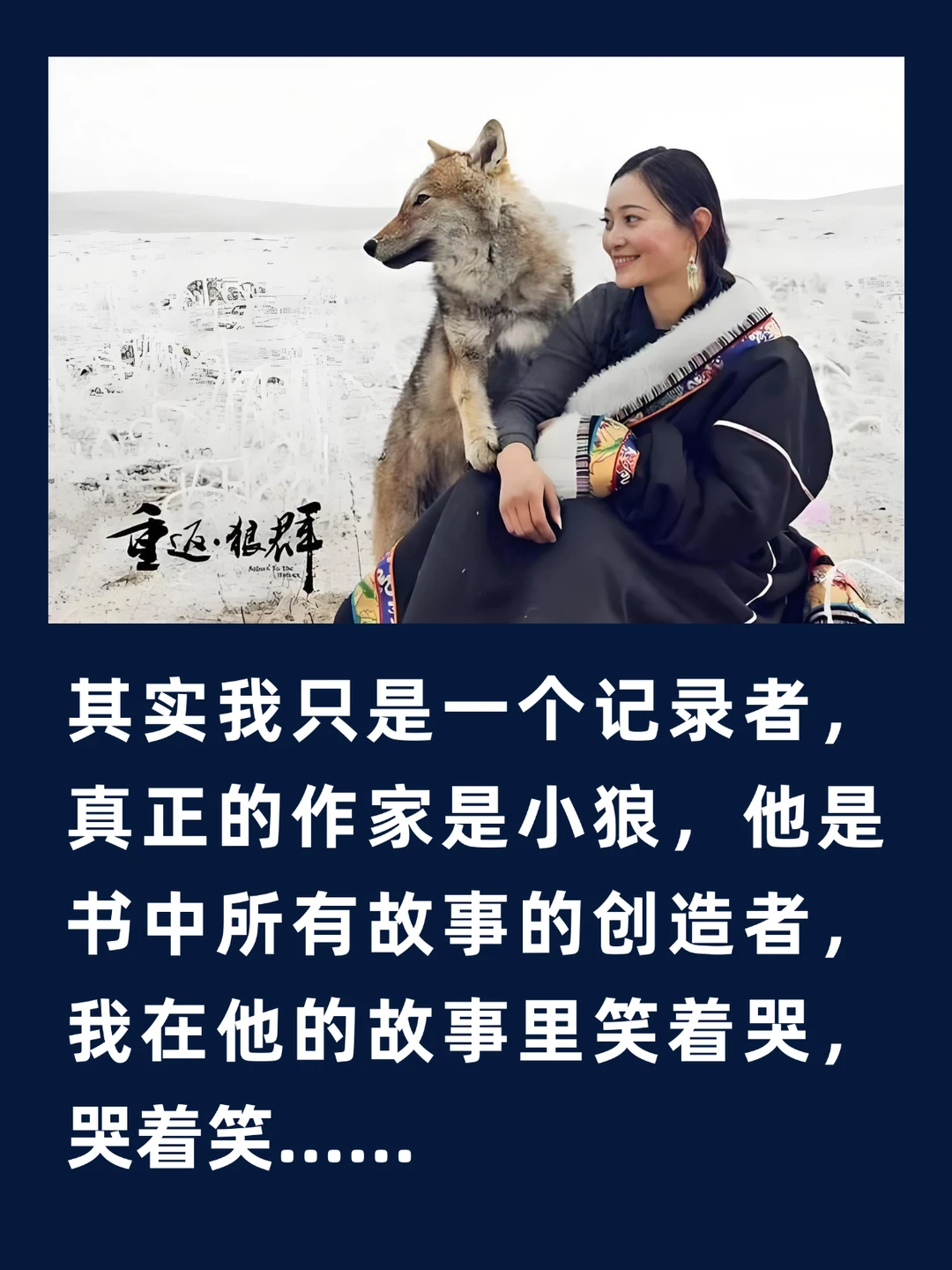 “其实我只是一个记录者,真正的作家是小狼,他是书中所有故事的创造者,我在他的故事里笑着哭,哭着笑……他要透过我的文字告诉人们有关自由、竞争、生存、梦想、尊严、情谊、草原和狼……”