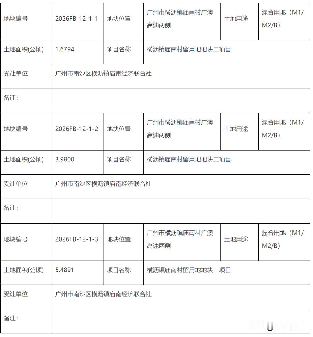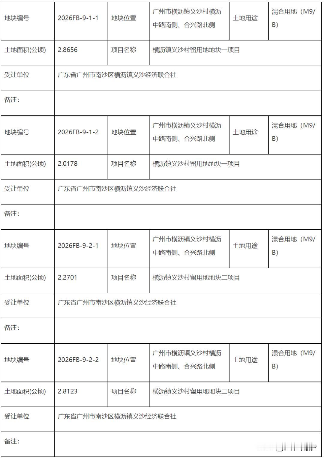 【两岛迎来暴击!灵山岛、横沥岛住宅区新增产业工业用地】南沙规自局一口气发布10则国有土地划拨用地批前公示,共涉及22宗用地,合计51.4684公顷(772.024亩)。 比较重磅的是横沥岛多块地块竟然从宅地变成了产业地块。 横沥镇义沙村4宗地块,地块均位于横沥镇义沙村横沥中路南侧、合兴路北侧,土地性质均为混合用地(M9/B),合计面积7.948公顷(119.22亩),地块一项目位于南沙中山一院东侧,地块二项目位于铂玥明珠ONE东侧。 值得一提的是,混合用地(M9/B)属于“新兴产业园+商业服务业”多用途混合类型。 要知道横沥岛西半岛一直定位都是宜居住宅,之前的控规显示,这些地块都是属于商业属性,这次突然改成了M9属性,不知道是为了响应之前的要大搞产融结合的方向,还是说只是手滑把属性给打错了。 另外灵山岛也不好过。因为庙南村也有3宗地块,均位于横沥镇庙南村广澳高速两侧,土地用途是混合用地(M1/M2/B),合计11.1485公顷(167.23亩),M1/M2/B则是属于传统的工业用地。 虽然不清楚具体地块的位置,但是结合广澳高速两侧来看,基本就是位于广大附属东侧的那些空地了。