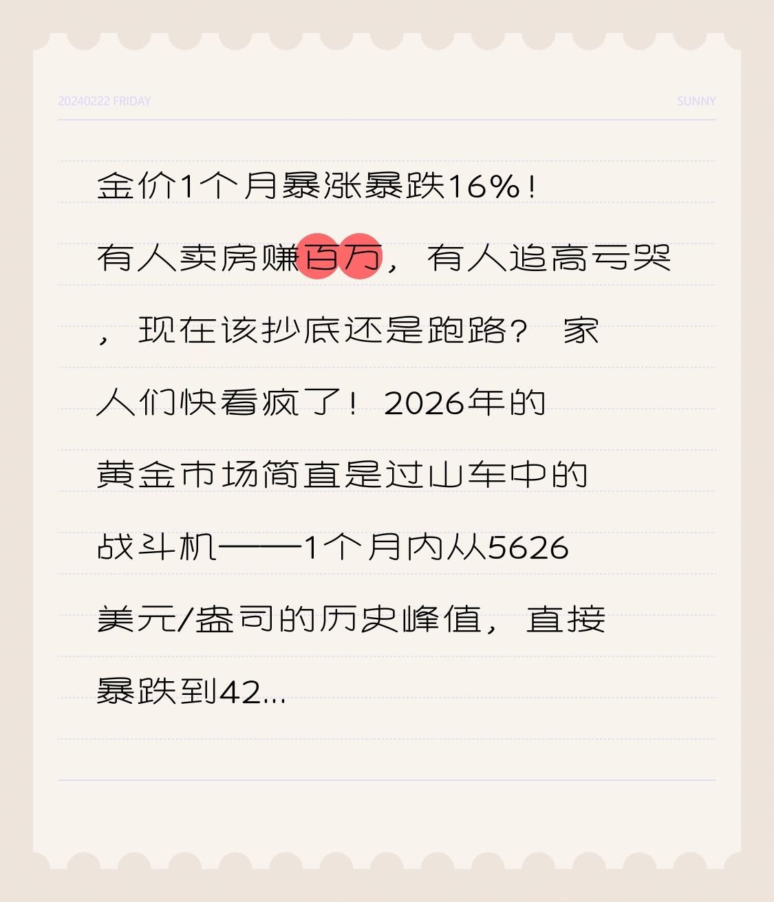 金价1个月暴涨暴跌16%!有人卖房赚百万,有人追高亏哭,现在该抄底还是跑路? 家人们快看疯了!2026年的黄金市场简直是过山车中的战斗机——1个月内从5626美元/盎司的历史峰值,直接暴跌到4200美元,跌幅高达16%,创下四十年最大单月跌幅,刚让人绝望到谷底,又突然暴力反弹6%冲破5000美元关口,多少人的心脏跟着七上八下! 北京菜百首饰的画面更是魔幻,1月29日金价暴涨时,百余米的卖金长龙从天亮排到天黑,大爷大妈提着红绒布袋抢着变现,回收价冲到1190元/克;可短短两天后金价跳水,买金的队伍又排到了门外,有人举着现金喊“抄底”,有人看着刚买的黄金瞬间缩水捶胸顿足。这波操作,真是有人欢喜有人愁! 河北的小郑绝对是最大赢家,2025年中不顾全家反对,把闲置的150万房产卖掉全买了黄金,谁能想到这波暴涨让他资产直接翻倍,现在带着家人环游世界,直言“当初被骂疯了,现在被羡慕疯了”。而孙女士就没这么幸运,看到金价一路飙升忍不住追高补仓,结果当天就遭遇暴跌,账户浮盈全没,连续几天不敢打开APP,直到最近反弹才缓过劲来。 更扎心的是陈阿姨,翻出1995年130元/克买的金项链,现在趁着高价变现给孩子还房贷,老物件意外成了“救急钱”;60岁的刘大爷2022年花40万给孙子买的1000克黄金,如今增值不少,老伴天天念叨“当初该多买点儿”。同样是买金,有人靠眼光躺赢,有人因跟风被套,差距到底在哪? 其实金价涨跌根本不是玄学!核心就看三点:美联储加息降息直接影响美元强弱,地缘政治波动催生避险需求,还有全球通胀压力支撑长期价值。专家早就提醒,刚需族别追涨,等5-8月回调到1100元/克左右再下手;短期投资者别贪多,快进快出别加杠杆;长期持有就分批布局,黄金占资产比例别超20%。 这波金价震荡,撞碎了不少人“一夜暴富”的幻想,也印证了“投资有风险,跟风需谨慎”的老话。黄金再香,也不能把鸡蛋全放一个篮子里,更别用借贷资金去赌。不管是刚需买金还是投资增值,理性永远比运气靠谱。 你身边有人在这波金价波动中赚了或亏了吗?你觉得现在该抄底还是观望?评论区聊聊你的看法,点赞转发给身边想买金的朋友,一起避坑!