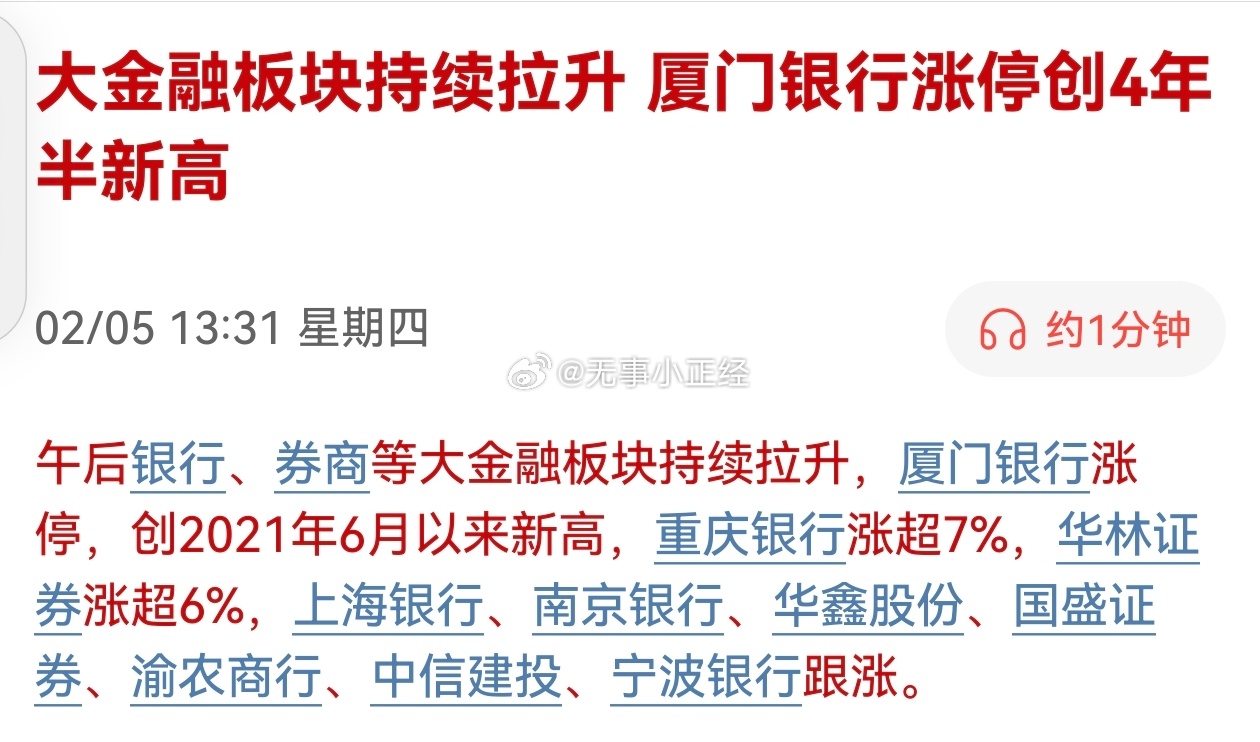 大金融板块持续拉升,厦门银行涨停创4年半新高