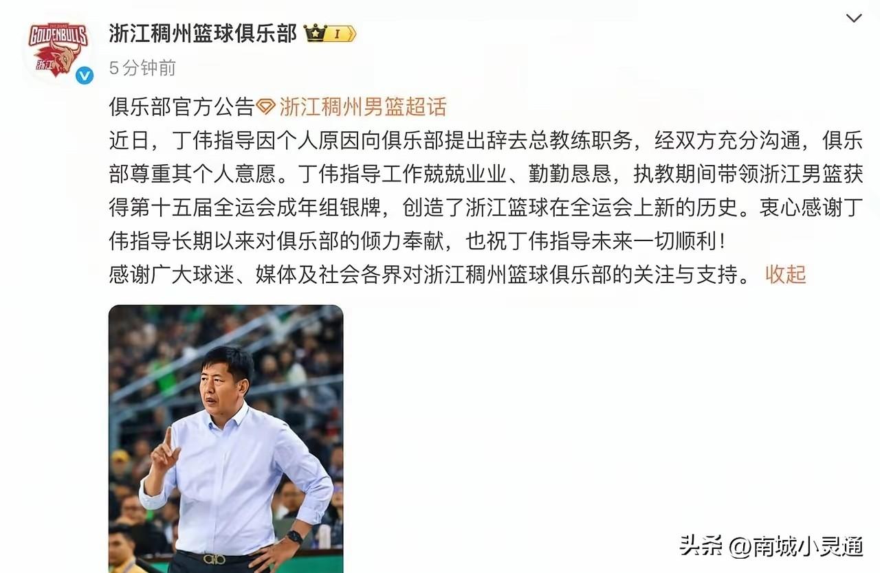 丁伟指导离开浙江稠州男篮总教练岗位了,俱乐部也发文感谢了丁伟指导对球队的帮助。发文双方友好协商后,丁伟辞去浙江稠州队总教练职务。 不得不说丁伟指导确实厉害,不愁下家啊。这里不行了,刚刚下岗,马上有球队继续邀请他上岗。 有时候没有主教练职务,他也是去各大平台直播解说比赛。凭他的战术素养,和对各个球队的了解。解说的风生水起!!! 大家猜一下,丁伟指导这次又要去那个队任职了?