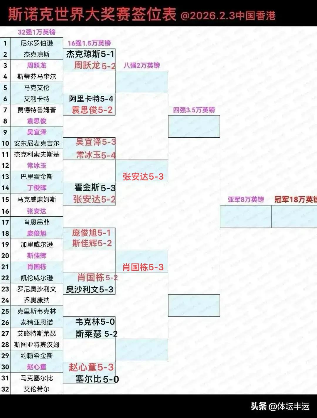 刚刚结束的斯诺克世界大奖赛1/8决赛两场比赛,肖国栋、张安达分别以5-3战胜奥沙利文和霍金斯双双晋级八强! 2月5号香港这场2026斯诺克世界大奖赛太精彩了!中国军团简直赢麻了。1/16决赛10人出战就丁俊晖一人被淘汰。1/8决赛里,肖国栋和奥沙利文的对战超刺激。比赛一开始肖国栋状态神勇,第一局就轰出单杆144分清台,第二局又单杆78分,2:0领先。奥沙利文也不示弱,追回两局,双方2:2平。但肖国栋稳住心态,最终5:3力克火箭晋级八强。 而张安达也不遑多让,5-3战胜英国的巴里·霍金斯晋级八强。中国选手太牛啦,期待他们后续更出色的表现!