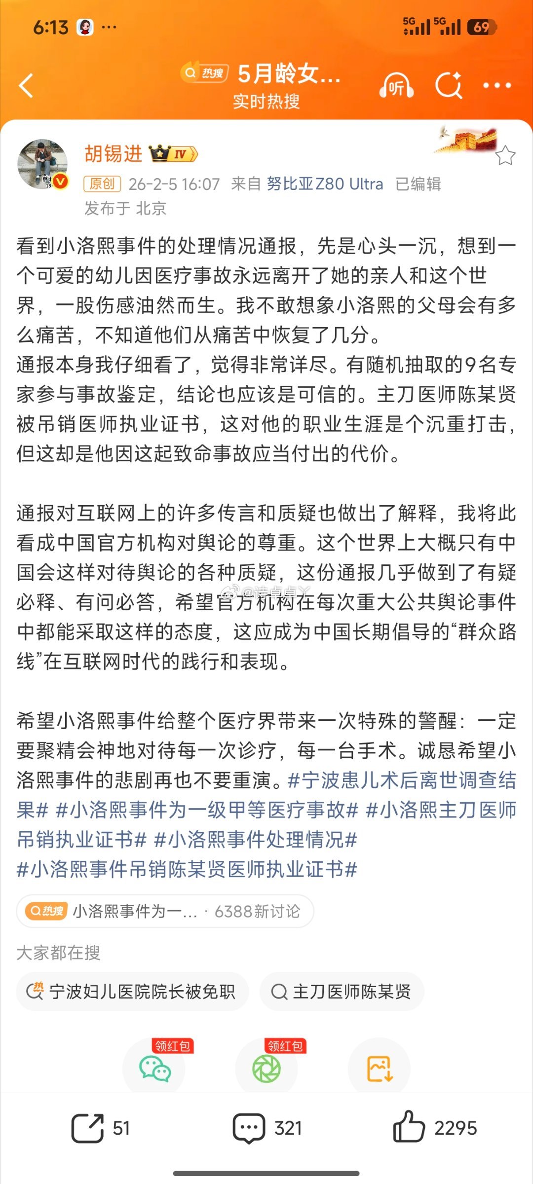胡锡进说这是对舆论的尊重,其实也是对每一个关心此事的普通人的交代。期待后续更多真相水落石出。
