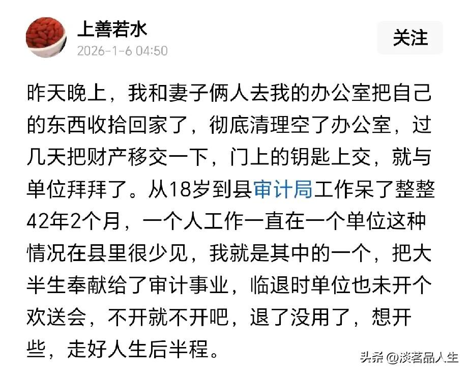 退休了,单位到底应不应该欢送一下,十多年前和现在确实不一样了。 记得十几年前单位有人退休时,领导都会召集相关科室的人员,再叫上主管副职,大家喝杯茶、聊聊天。中午找个饭店摆一桌,大家尽情喝酒叙旧,一般退休的人的人都会喝多,很多人还会留下不舍的眼泪。毕竟大家在一起打拼了几十年,有些人在一个单位甚至是一辈子,很有感情的。 这些年由于形式变化,吃喝肯定没有了,最多也就是领导找你说几句话,安慰一下就算过去了。而这两年就是下文中说的一样,退休除了人事部门通知一下,根本没人理你了。很多人确实感到很凄凉,干了一辈子静悄悄的就走了,很多人心里感觉没人关心要退休的人。