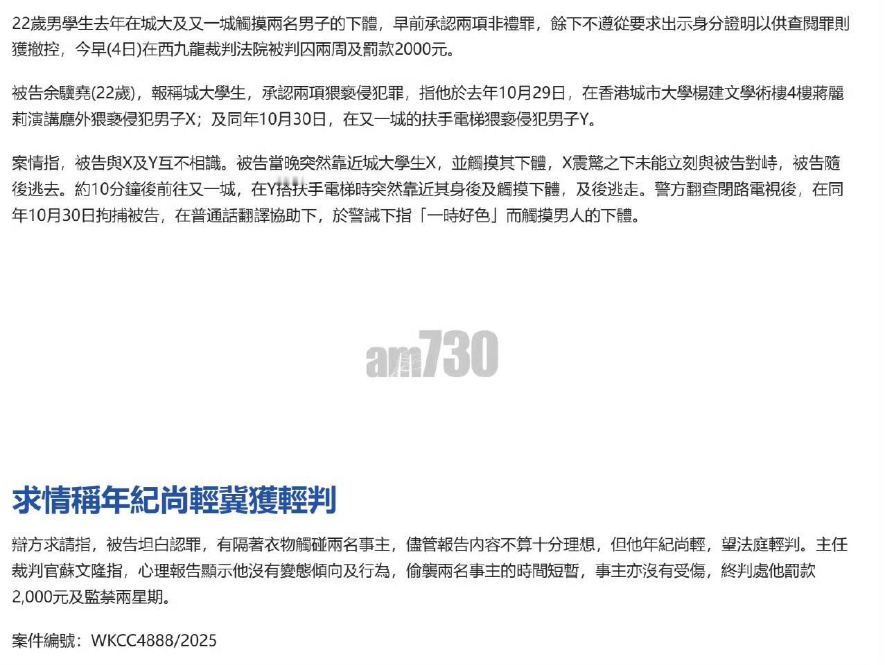 香港城市大学一位男学生,一时好奇,摸了两名男生下体。 昨日被法院判囚两个星期及