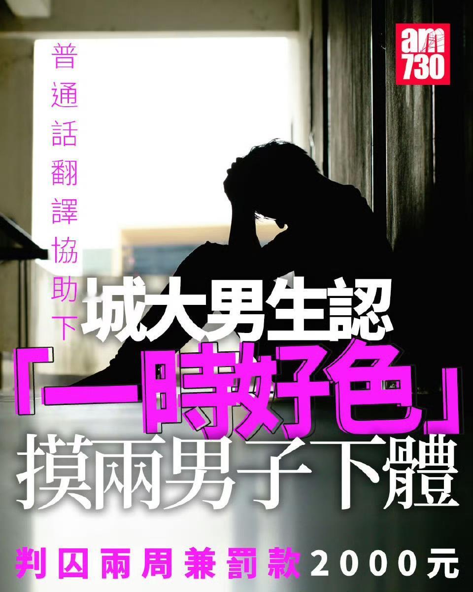 香港城市大学一位男学生,一时好奇,摸了两名男生下体。 昨日被法院判囚两个星期及罚款2000元。
