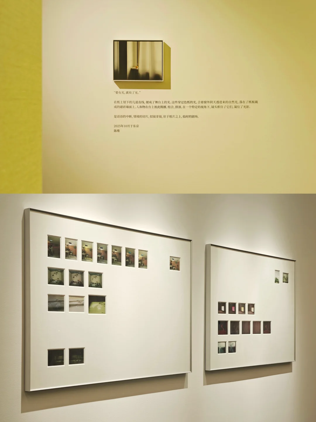 现场通过灯箱、色彩漫射、自然光路径的精心设计,让光源成为“场景构建者”:穿过色纸的人工光与阴天自然光交织落在墙面上,使日常物件在特定光线中暂时获得戏剧意义,光影移开后回归沉默。