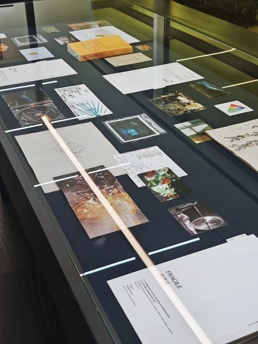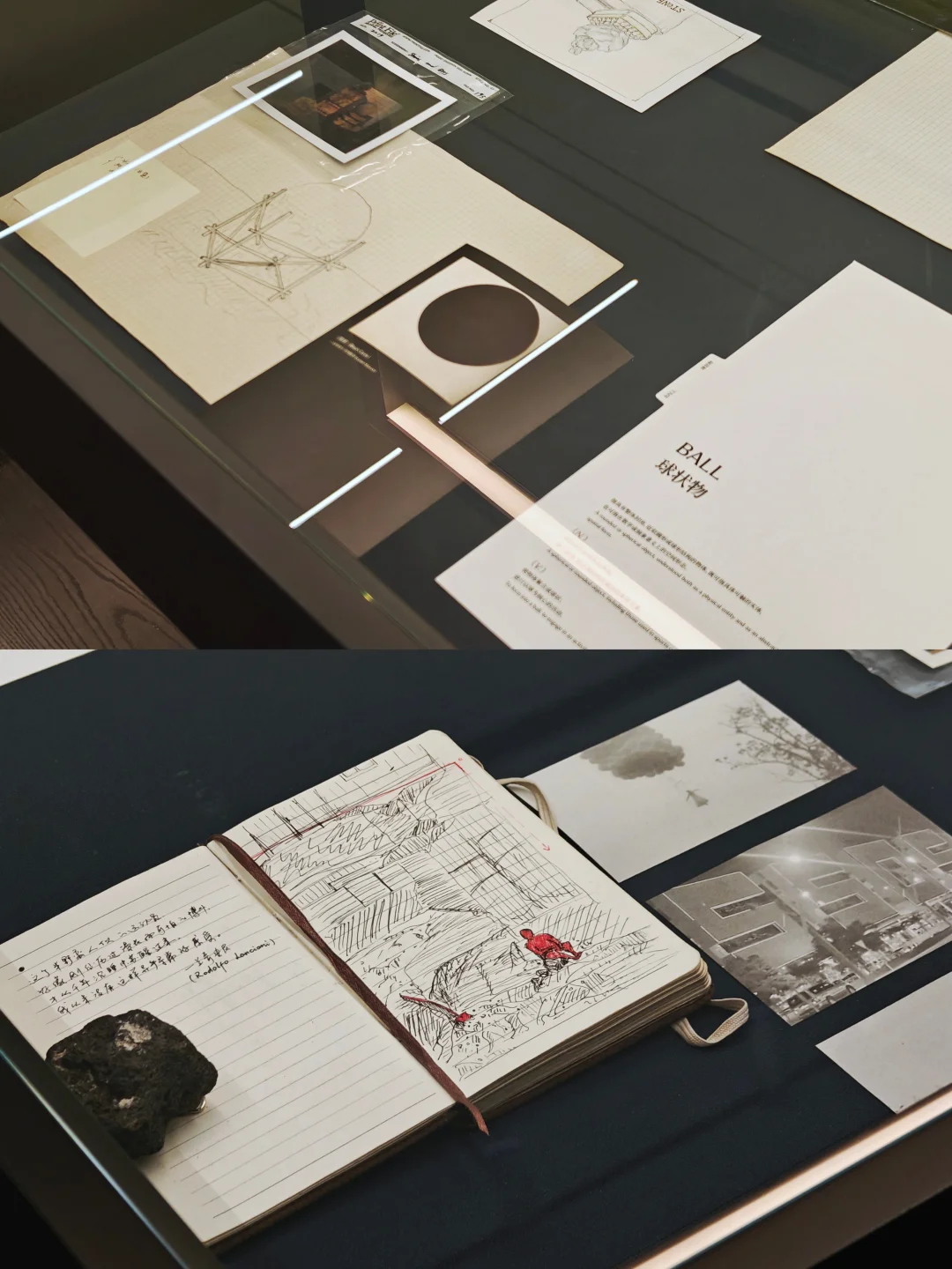 中央的档案柜,如同视觉思维的抽屉,通过影像作品、创作手稿、档案资料与空间并置,回溯作品从观念萌芽、草图推演到空间落地的全流程,让观众直观看到创作脉络。