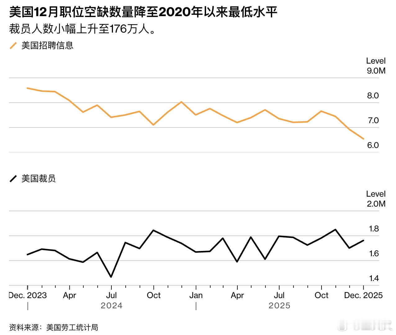 与此同时,美国12月职位空缺数量降至654万,创2020年以来最低水平,也低于所有市场预期。下滑主要集中在专业服务和零售行业,而运输和仓储领域裁员明显增加。虽然招聘人数有所回升,但整体仍然疲弱。目前每名失业者对应的岗位数量约为0.9个,远低于2022年高峰时期的2比1水平。这说明企业普遍采取防守姿态,不再积极扩张,而是观望经济走向。