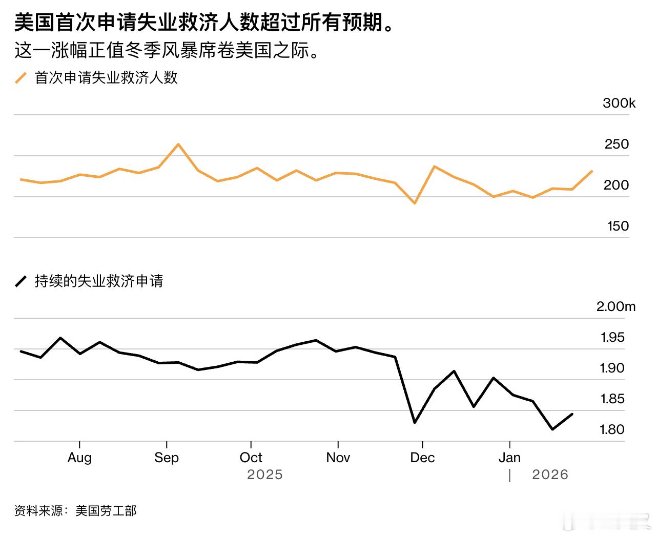 最新数据显示,美国1月底一周的初请失业金人数上升到23.1万人,明显高于市场预期,持续领取失业金的人数也升至184万。官方解释认为,极端寒潮和暴风雪导致企业停工、物流受阻,是这次数据走高的重要原因。因此,这一轮上升并不能完全等同于经济突然恶化,更像是天气冲击叠加短期扰动的结果。从四周均值来看,目前处在偏弱但仍可控的区间,说明就业开始变得脆弱,但尚未失控。