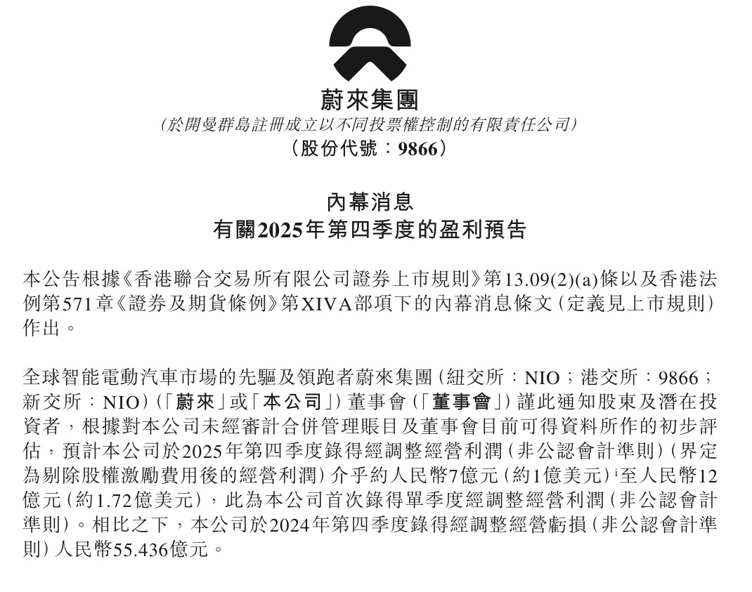 成立11年!蔚来发布重磅公告,首次实现季度盈利,四季度净利润7-12亿元。