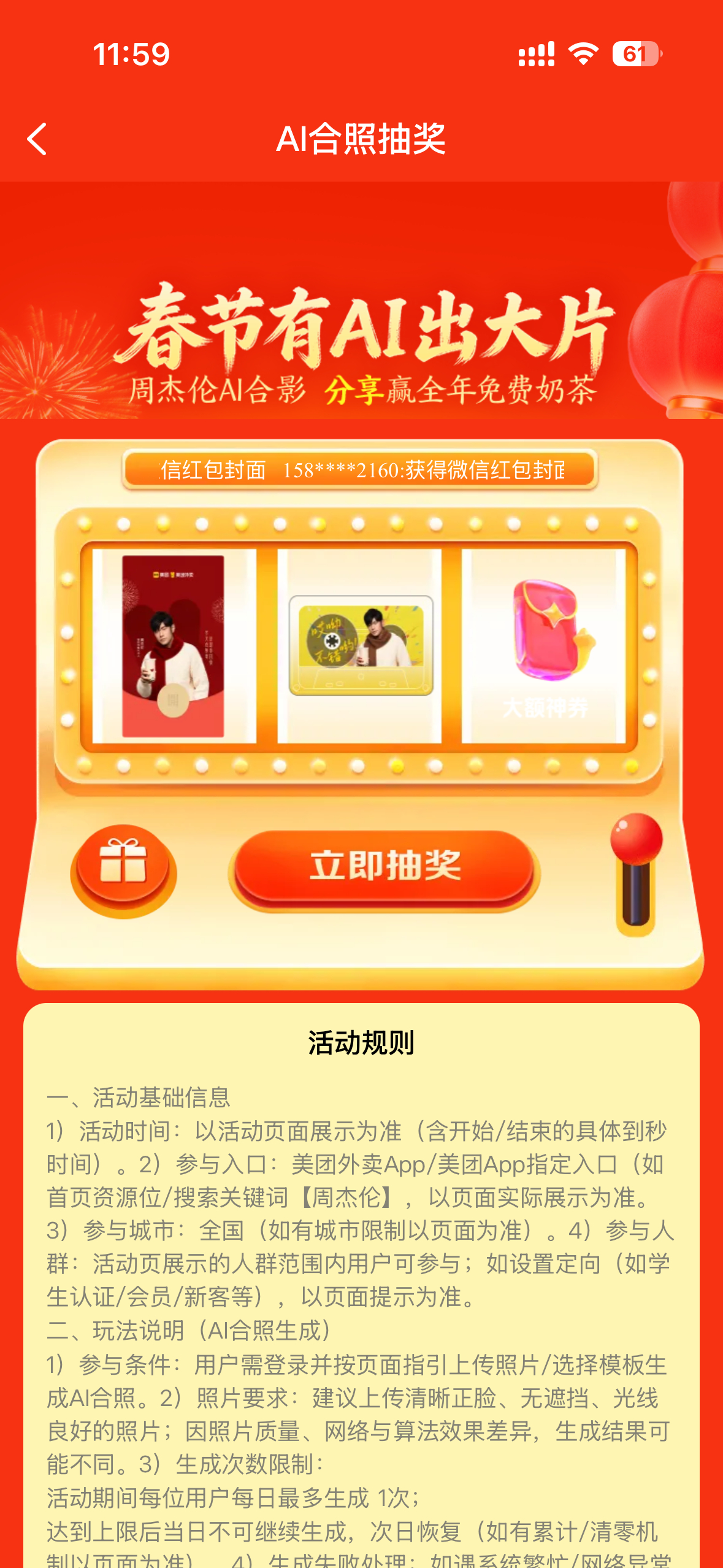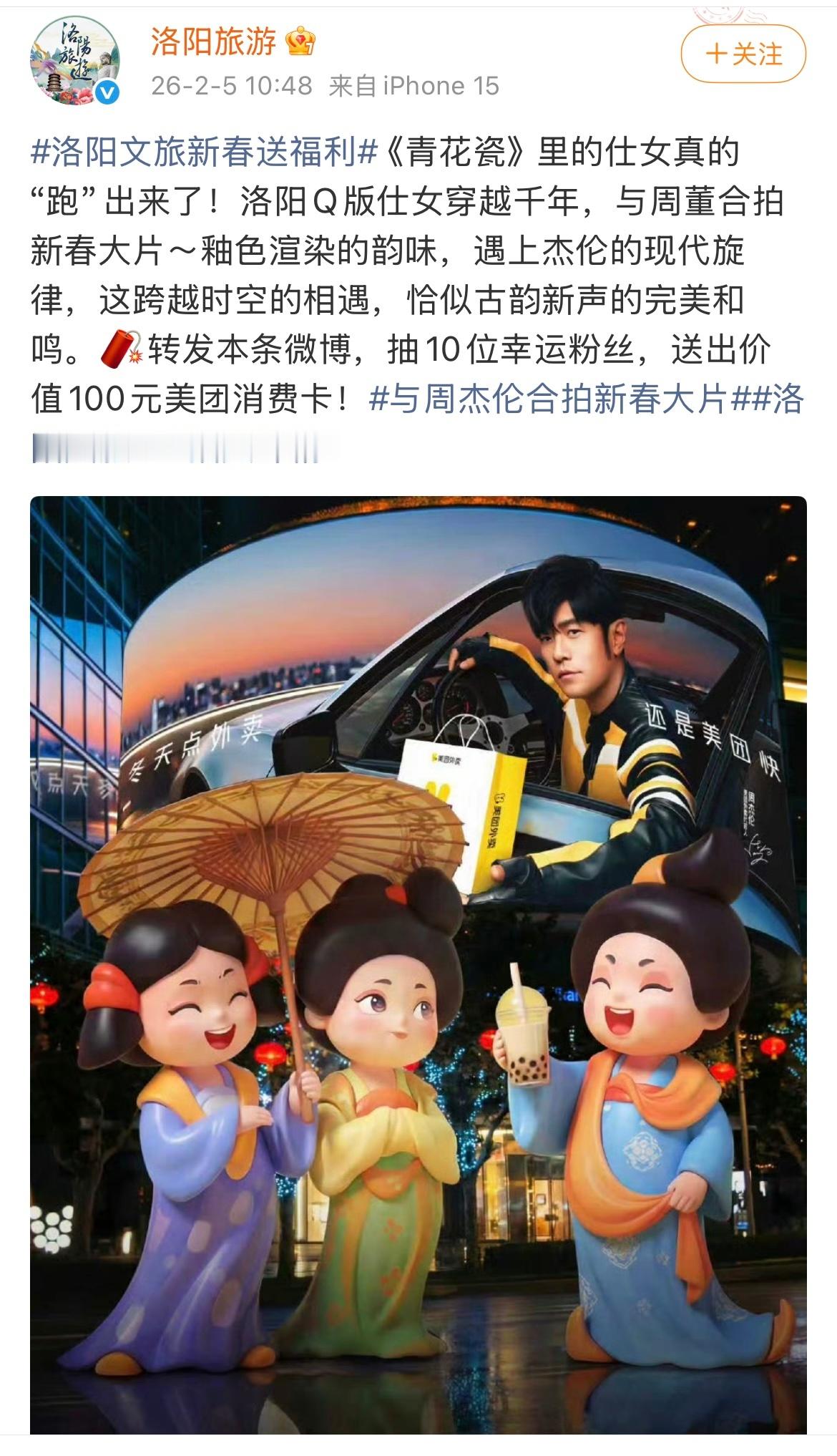 这下我真的要夸爆美团外卖了!毕竟大过年的和周杰伦的合影照片,一发朋友圈还不得被问爆了!周董的热度还真是不减当年,就连山东、洛阳、哈尔滨、武汉等等文旅都带着自家爆火IP合影了!现在上美团/美团外卖App,搜【周杰伦】解锁同框AI合影吧,分享合影还可以抽全年免费奶茶!与周杰伦合拍新春大片网页链接