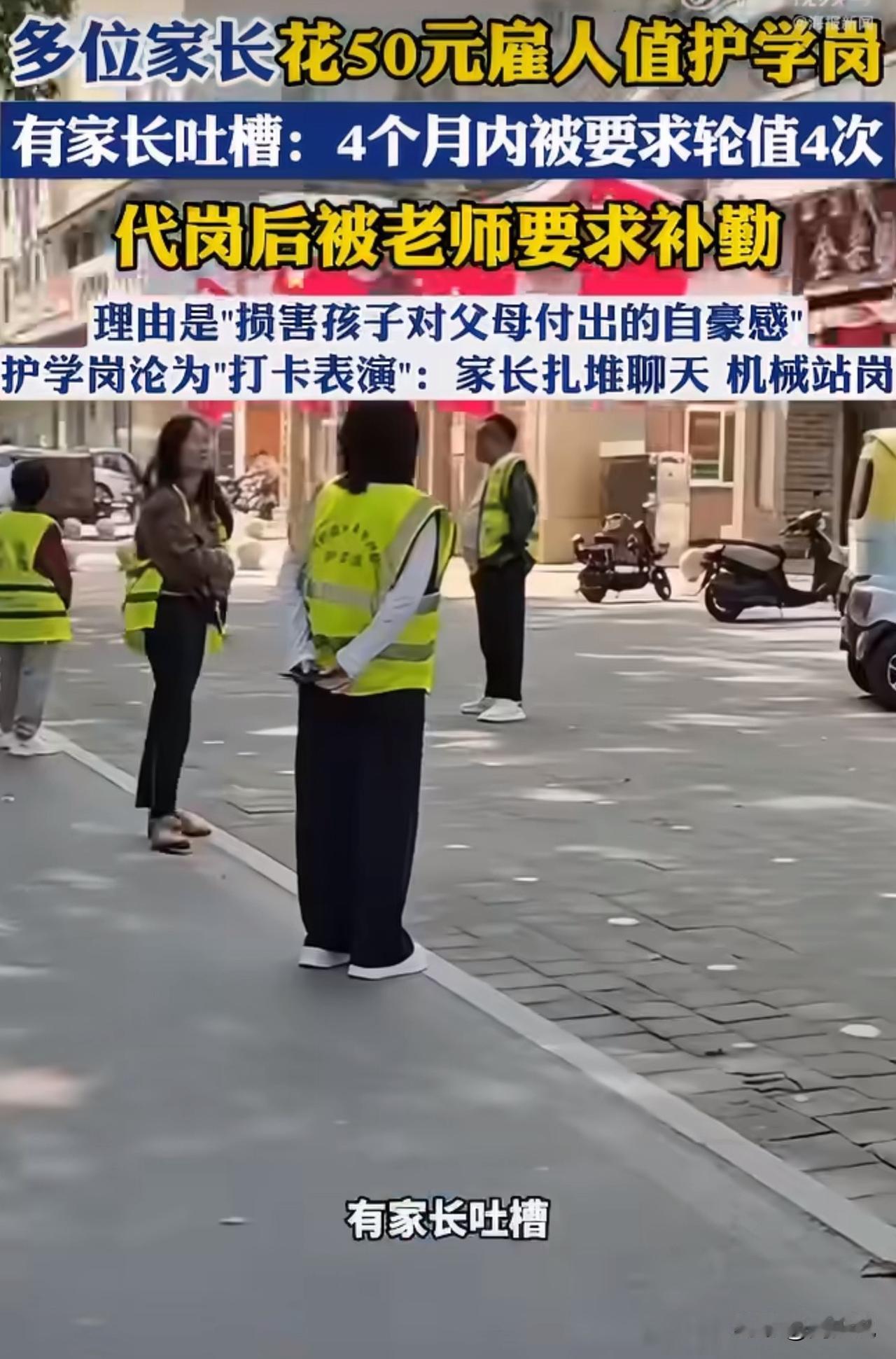 “一学期竟轮4次岗,双职工家庭真顶不住!” 近日,家长吐槽护学岗的话题引发热议。有广东家长直言,自己怀孕38周时曾站岗,如今更是抱着小宝给大宝执勤,身心俱疲。不少人无奈之下,花50元雇人代站。校门口明明有警察和保安,家长岗却成了“打卡表演”,有人扎堆聊天,有人机械站岗,形同鸡肋。 此事曝光后,网友纷纷留言:“自愿参与却变相摊派,校方太不体谅”。 也有网友说:“护学是责任但不是负担,频次该合理调整”。 更还有网友提议:“双职工、特殊情况的家长,该有灵活替代方案”。 在周少看来,护学岗的初衷是凝聚家校合力,而非给家长添堵。可以说,校方的出发点或许是好的,但忽略了家长的实际处境:双职工难抽时间,特殊情况的家长力不从心。 换句话说,与其搞“一刀切”的轮值,不如优化方案。比如根据家长情况自愿报名,设置弹性执勤时间,或减少不必要的轮值频次。 真正的家校共育,从来不是单方面的负担转嫁,而是互相体谅的双向奔赴。校方不妨多站在家长角度考量,让护学岗回归安全守护的本质,而非形式化的任务。 这样既不违背初衷,也能让家长心甘情愿参与,这份默契与理解,才是给孩子最好的教育示范。#寻美三湘#