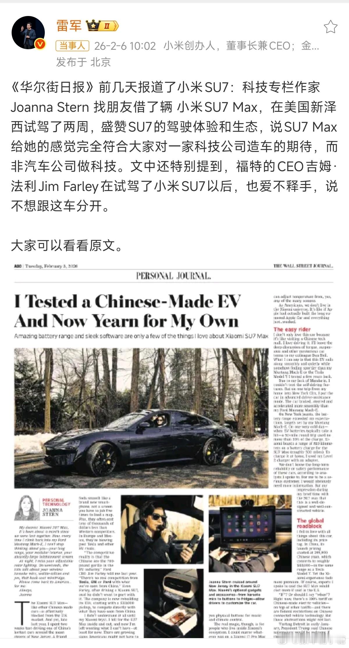 雷军回应福特CEO大赞小米SU7大V聊车 能被老牌车企的老板借来试驾体验研究,这