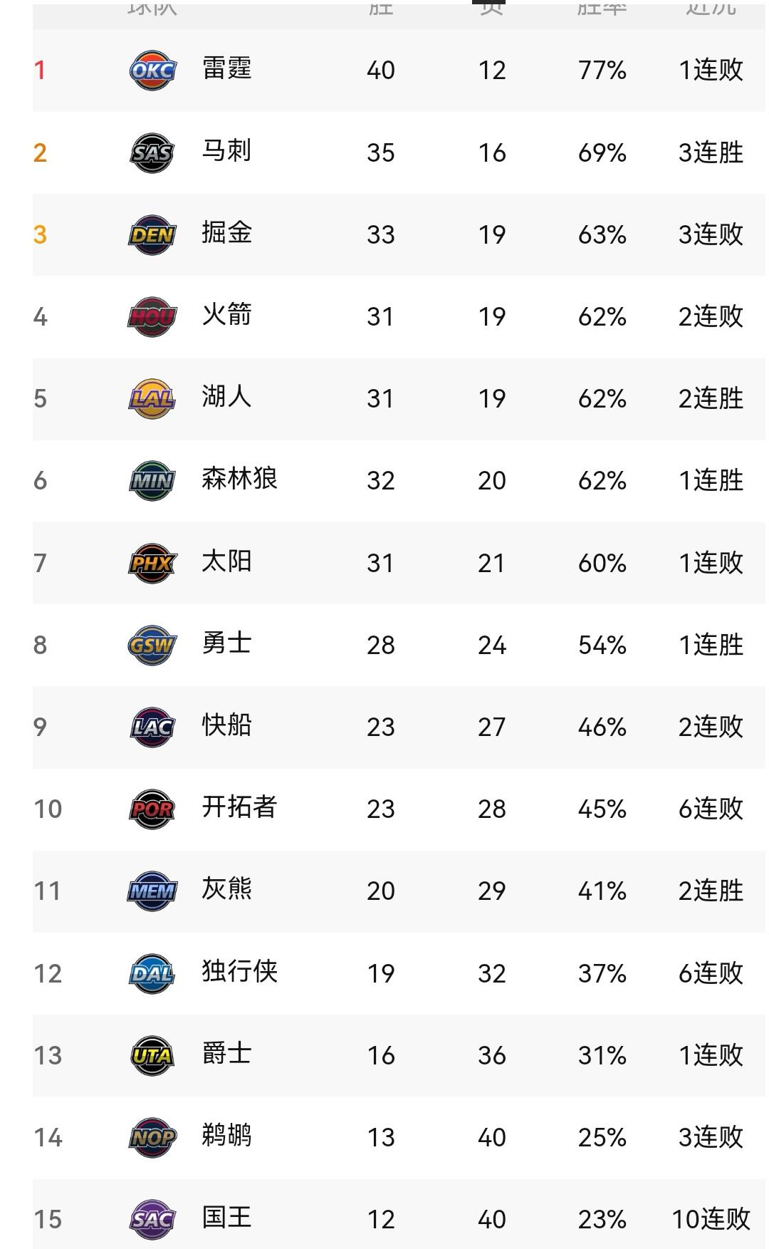 马刺再胜雷霆,勇士险胜太阳,火箭背靠背连败,NBA新一轮之后看西部排名 本轮N