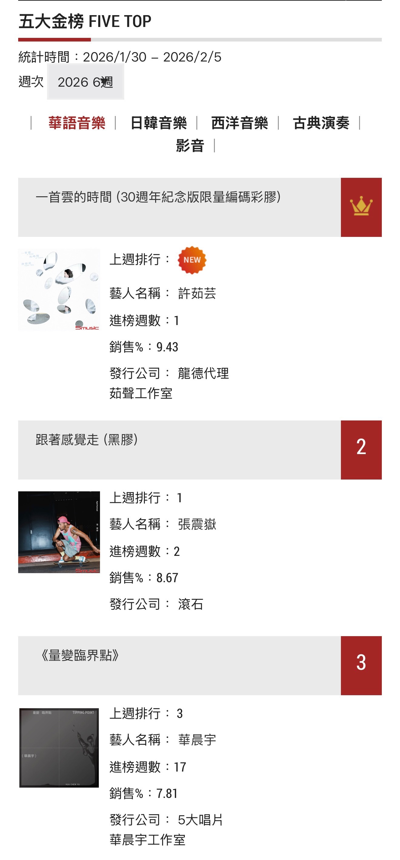 在许茹芸空降五大金榜冠军的这周,收到了来自台湾的唱片,正好张震岳也在亚军,华晨宇这张进榜17周还在第三名,真厉害。