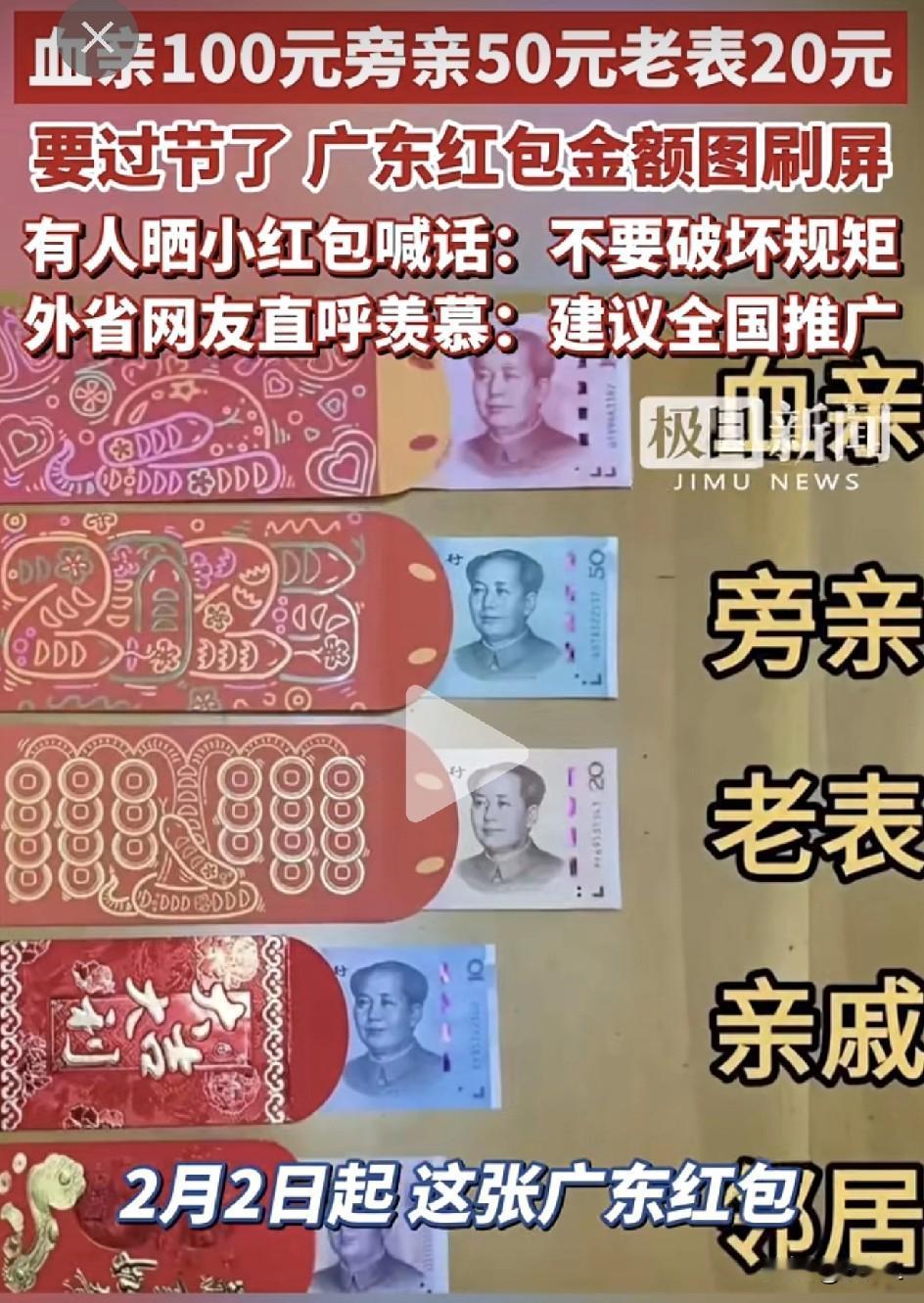广东过年红包“定价表”突然爆火!全国网友:求全国推广! “血亲100,旁亲50,老表20,亲戚10块,邻居5块,拜神2块……”这不是菜单,是最近刷爆全网的“广东利是参考图”! 外地网友目瞪口呆:“原来红包还能按‘亲情距离’打折?” 一到过年,好多的北方人都在为“压岁钱起步价500”发愁时,广东人早已实现“红包自由”。 结婚不怕“破产”,小孩不嫌钱少,邻居见面笑呵呵递上5元“吉利封”。 有网友调侃:“在广东,发红包像发优惠券,见者有份,童叟无欺!” 这背后,是广东人刻在DNA里的“利是哲学”: 💰 重意头不重厚度——红包叫“利是”,只图“利利是是”的好彩头; 🤝 讲心意不讲排场——5元10元照样红红火火,杜绝人情绑架; 🎉 要普惠不要内卷——从保安到保洁,从同事到早点摊老板,一句“恭喜发财”就能换回一份暖心祝福。 更让外地人羡慕的是: 广东新婚夫妻过年备200个红包不心疼,小朋友收红包收到手软却“不伤钱包”。 有某地北方网友算账:“在老家发一个红包的钱,够在广东派一个排!” 当全国都在感慨“年味变成钱味”时,广东却用小额红包守住了春节的纯粹: [红包]红包再小,拆开时那声“哇!”是真的; [红包]金额再少,递出去的那份祝福是热的。 说到底,广东利是就像一碗老火汤: 不追求贵价材料,要的是那份温热实在的心意。 关键,广东不仅仅派红包不心疼,彩礼也只是图个好意头而已。去喝喜酒的红包,也不过是一两百元,主家还会有回礼,有时将红包折一角奉还,表示心意已收到。 你们家的红包金额是多少?一起来聊一聊吧!就说每年封红包封的肉不肉疼?[偷笑][偷笑][偷笑] 素材来源:极目新闻,侵联删!