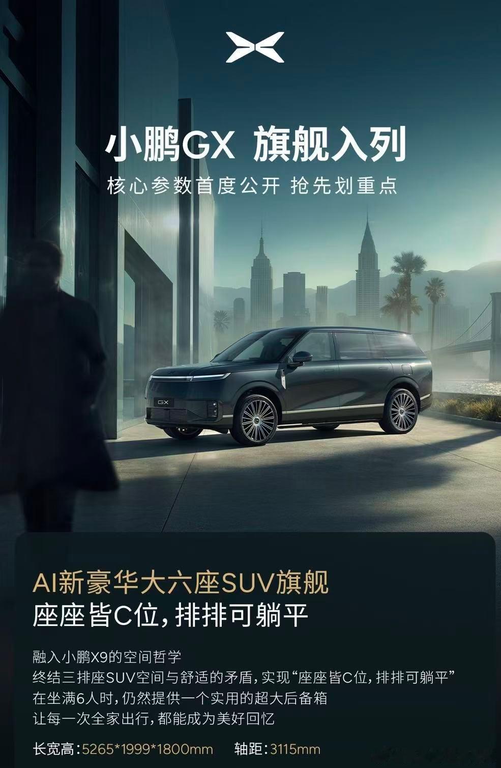 今天何小鹏又发布了小鹏GX一组新图,并透露了新车预计四五月正式上市!作为小鹏首款AI新豪华大六座SUV旗舰,小鹏GX即将登场。根据工信部释放的信息,小鹏GX车身尺寸为5265*1999*1800mm,轴距达3115mm,座座皆C位,排排可躺平,满座6人后备箱依然能装下全家行李;配备最顶的线控转向与后轮主动转向技术,能让大车开出小车感,更舒适更好开。小鹏GX用科技兑现全新高端体验,重新定义高端大六座SUV,是全家出行的全能的旗舰之选,值得期待!关键字 大六座 四图灵 l4 小鹏GX小鹏GX预计四五月上市