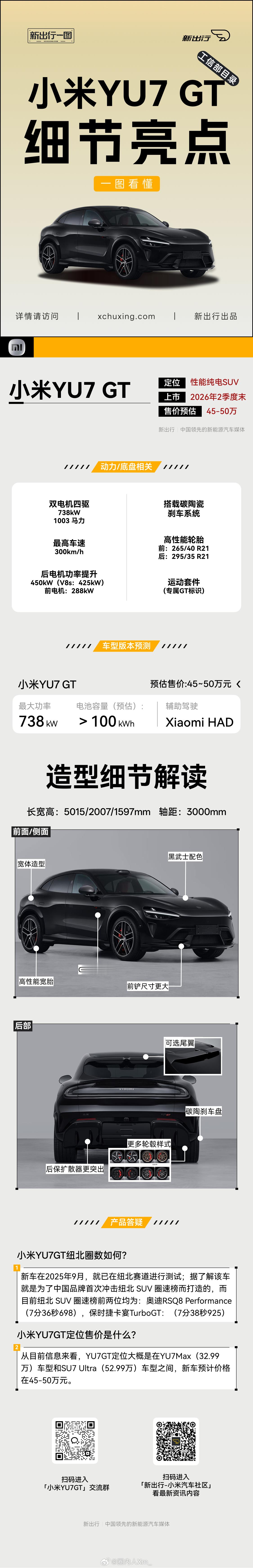 参考YU7 Max满配 38 万,YU7 GT版升级到了1003 马力、全新电机、硕大的前铲+扰流板、295大宽胎、碳陶盘,光这些看得见的配置加起来就超七八万了,加纽北赛道调校投入的研发费用,保守估计45 万起~~~这个预估性价比都可以直接吊打百万燃油性能 SUV了。