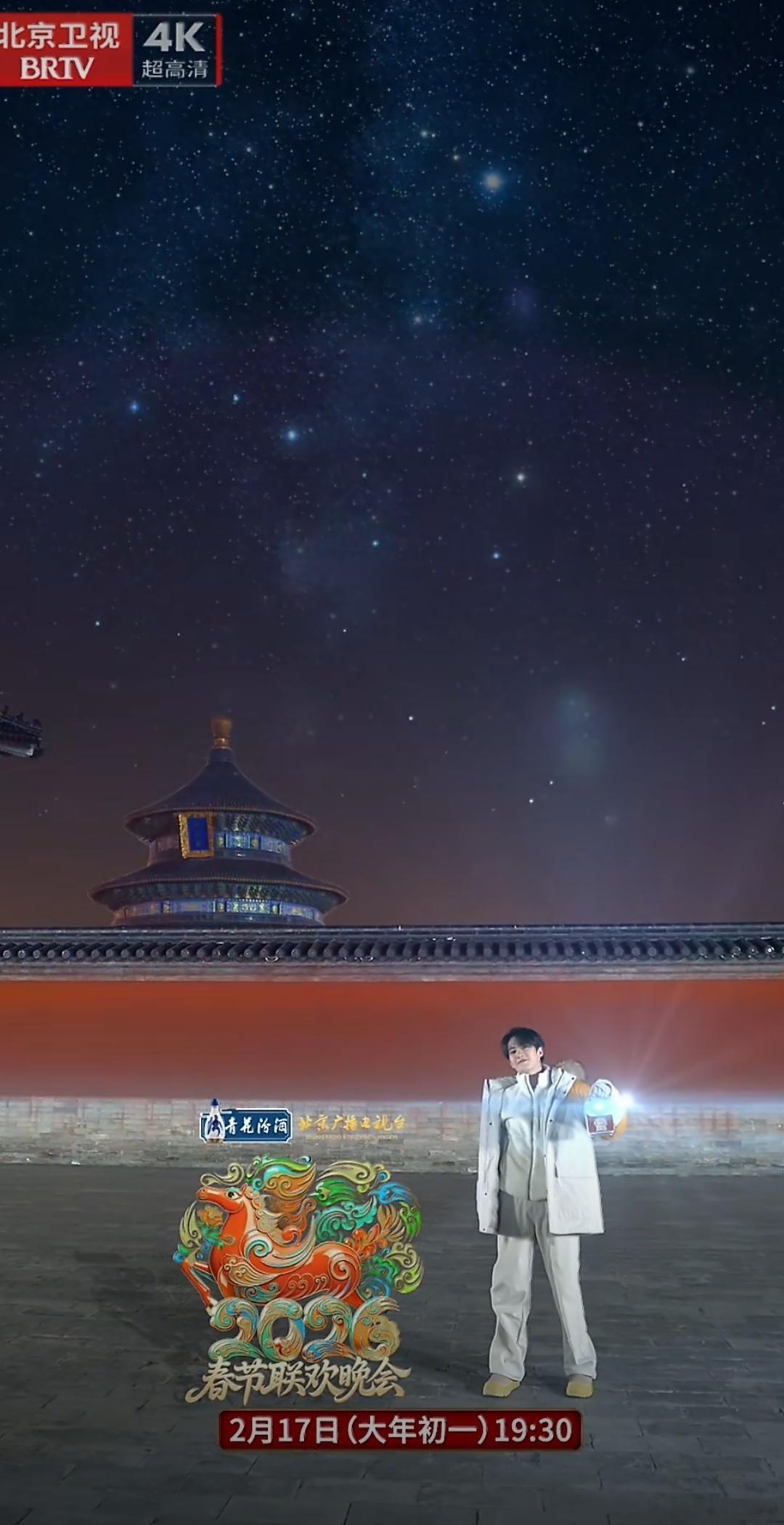 檀健次天坛为北京台春晚开场檀健次以宣传大使的身份加盟2026年北京台春晚,一则光影结合的短片诠释以梦为马,共赴新程之意。