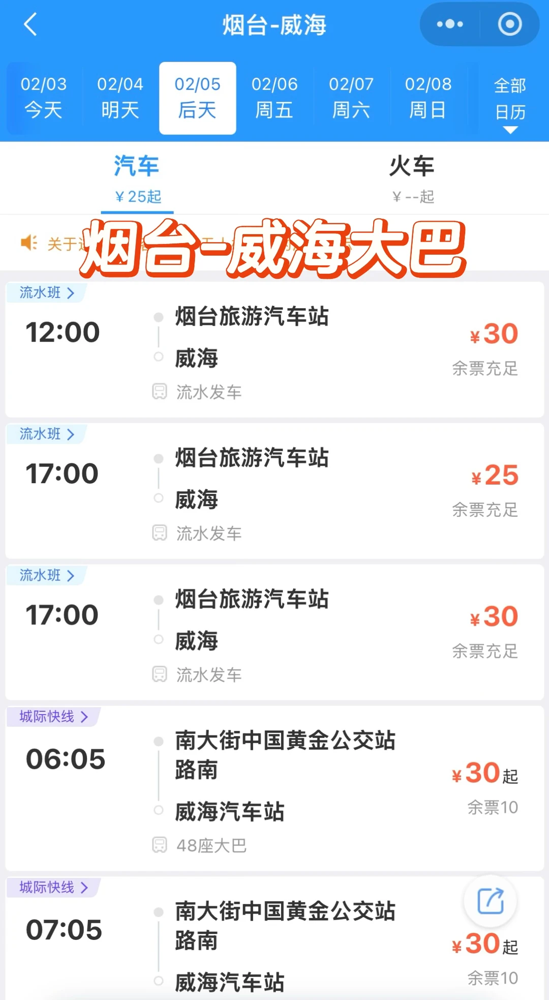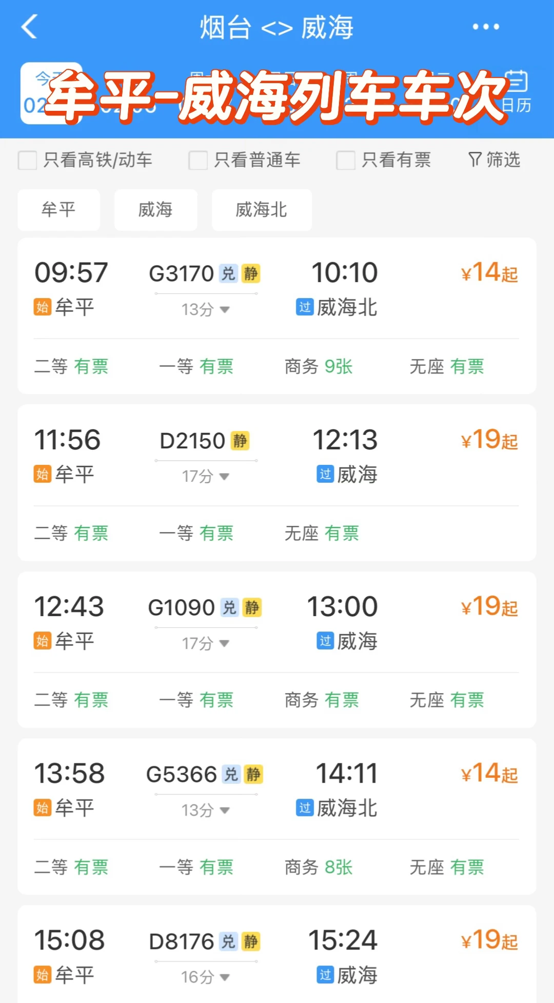 由于烟台南站施工,就导致整个烟台主城区,近期都没有到威海市区的直达火车(含高铁和动车)。 [向右R][向右R]所以呢~~ ▫️烟台到威海,最近火车站是牟平站。 ▪️牟平站-烟台站驾车距离约34公里 ////////////////////////////////手动分割线///////////////// [加一R][加一R][加一R]适用于近期烟台-威海N种交通方式 1️⃣烟台-威海大巴(图2 🎫票价30,流水班发车,车程约2小时 ▪️烟台乘车点:烟台旅游汽车站 ▫️烟台站北广场右转就是汽车站‼️ 🙋目前来说这是烟台到威海最方便的公共交通,另外同是这个汽车站,有到烟台机场的机场巴士。 2️⃣烟台机场-威海大巴(图3 ⚠️终点站威海汽车站,会路过火炬八街 🕒烟台机场-威海发车时间09:20-20:00,不是流水班!!班次会因季节调整,详情以当日购票页面信息为准~ 3️⃣网约车(顺风车/拼车/专车🚗 4️⃣最后一种::牟平-威海(图4-5 →牟平是烟台市的一个区,是目前烟台到威海最近的一个火车站,停靠威海北站或威海站。 [向右R]烟台站-牟平站驾车距离约34公里 [向右R]高铁巴士6号线直达牟平站,1小时+ [向右R]牟平到威海高铁13-17分钟 ↪️↪️↪️个人推荐路线 ✔️先养马岛,再打车去牟平站,高铁到威海 ✔️比较适合外地游客,也是我自己的路线 ☑️养马岛也是烟台比较著名的一个景点,逛一圈的话至少大半天,所以特别适合从烟台市区出发游客,先到养马岛逛一圈,再从养马岛直接打车到牟平站,坐高铁去威海。