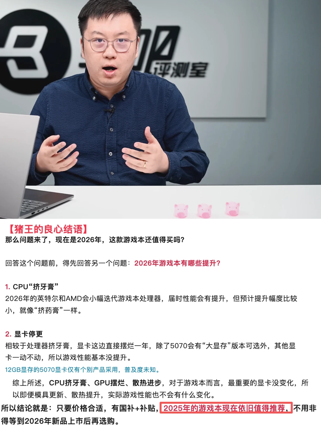 看了笔吧的文章,我感觉猪王说的挺有道理的,与其等26年发新品,不如抄底25年旧款,特别是关注性能的,CPU挤牙膏、显卡停摆,压根就没有新显卡发布,无非一些产品更新个模具,核心性能提升近乎0,而且内存涨价那么高[汗颜R]厂商发的新品也会因为控制成本而挤牙膏