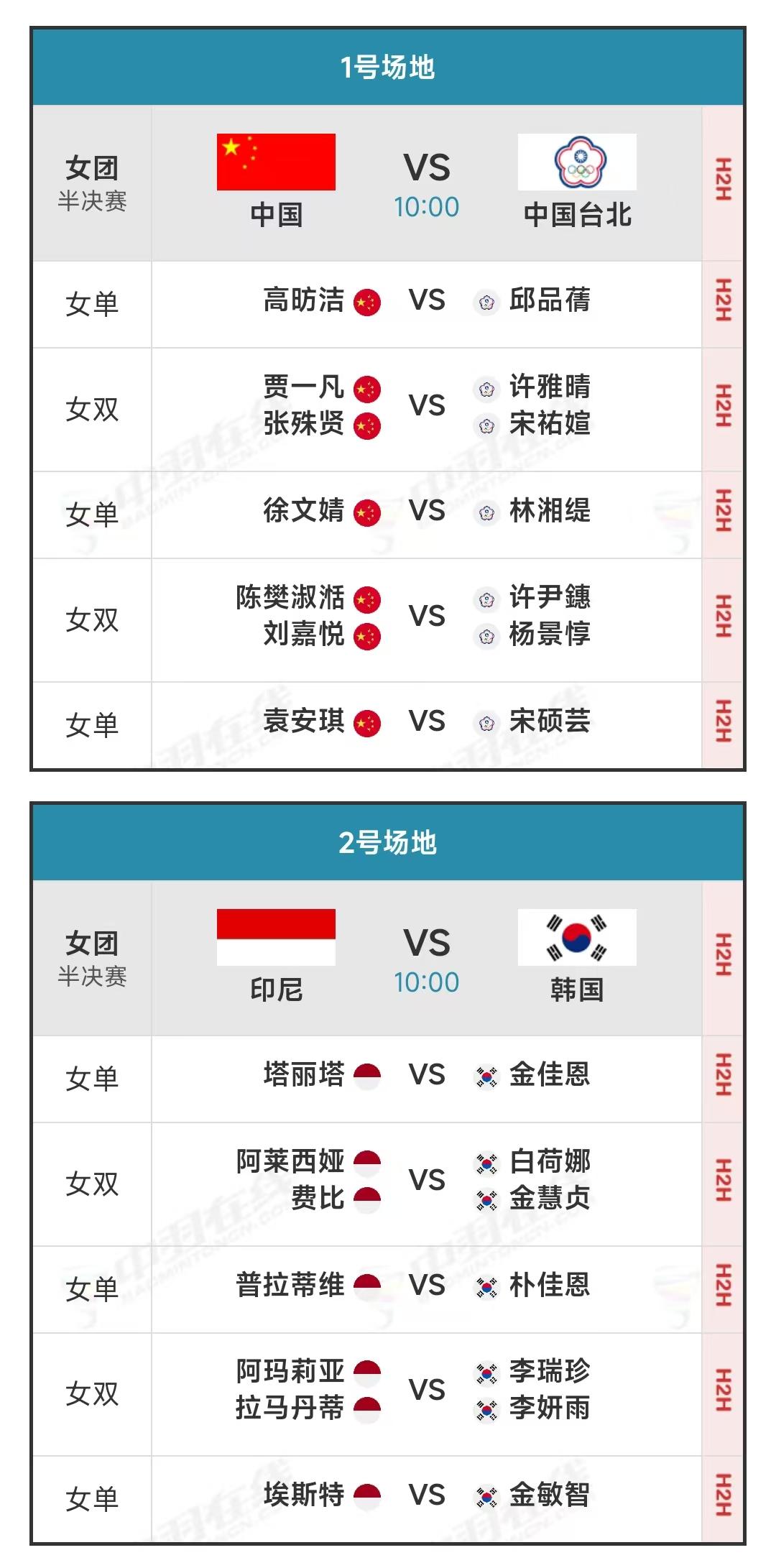 今天,亚洲羽毛球团体赛决出男女团的四强。中国女队下午的时候,战胜印度队,晋级四强,将在明天10点开始的比赛中,对阵中国台北队。 进入四强后,韩国队也取得了尤伯杯的参赛资格,此前几场比赛一直出战的世界第一安洗莹,在半决赛中休息了。韩国队金佳恩成为第一单打。 中国男队在晚间击败中国台北队,顺利晋级四强。作为二双出场的何济霆/任翔宇2-0击败王齐麟/邱相榤,为中国队拿下关键一分。明天将在半决赛中迎战韩国队。 韩国队在今天的1/4决赛中,战胜了印度队。此外,日本队3-0胜马来西亚队,印尼队3-2胜泰国队。半决赛中,印尼队对阵日本队。