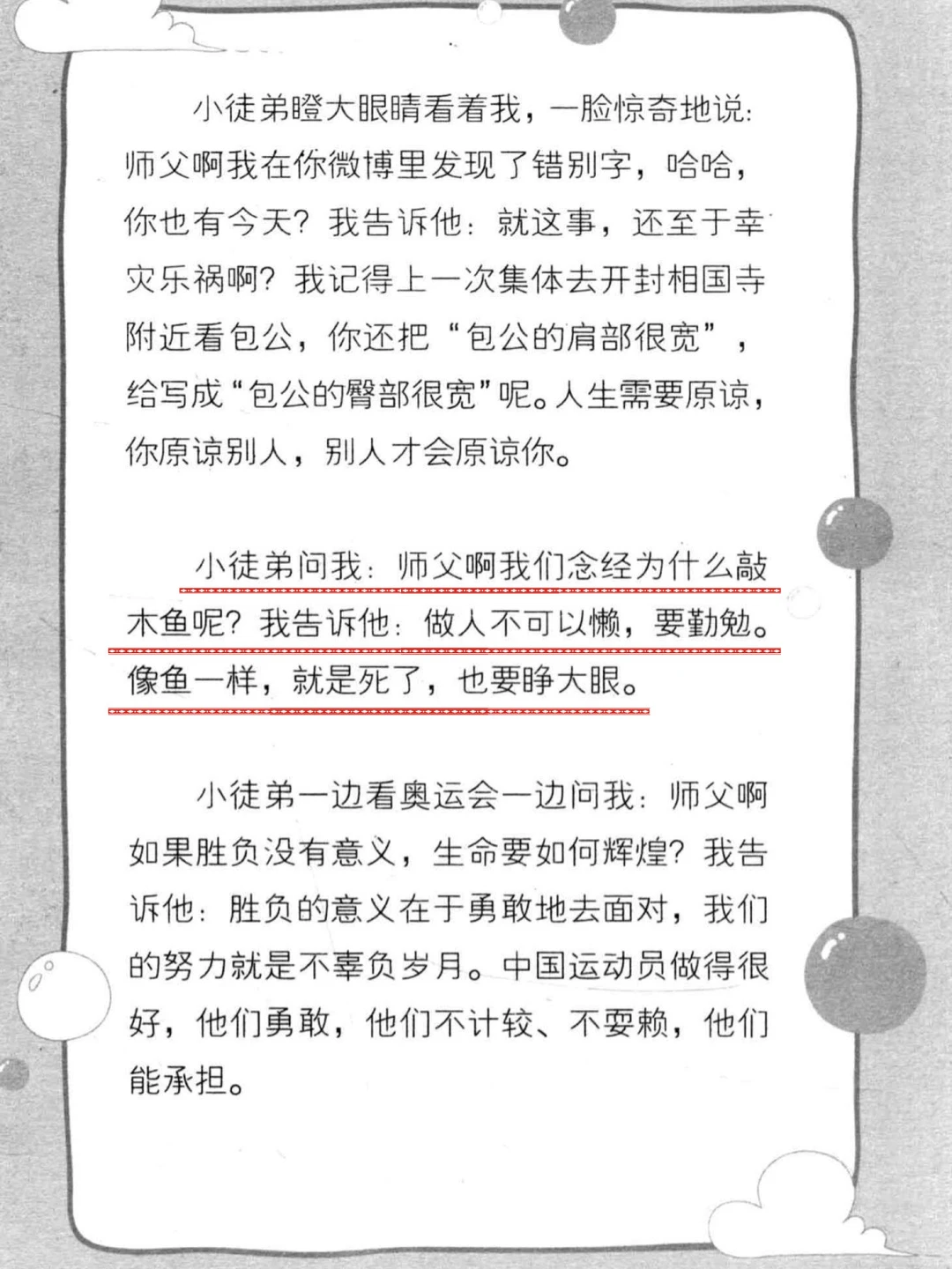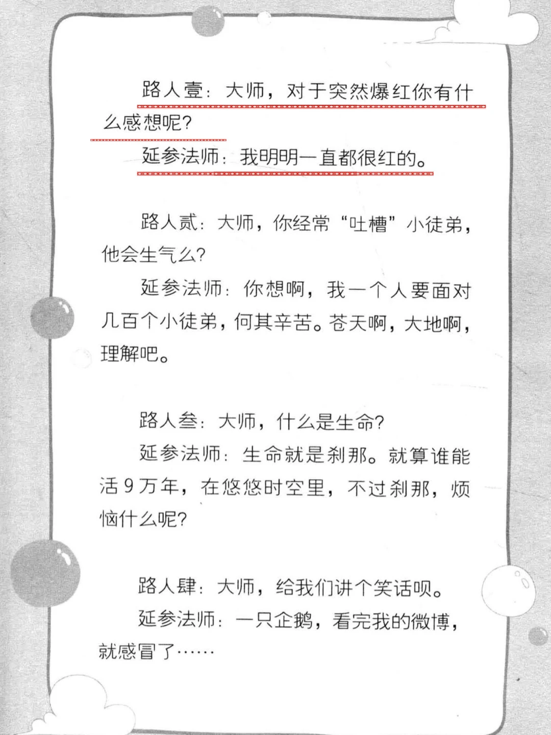 最近在看延参法师的《这个和尚有点萌》 太幽默风趣了……果断分享给大家 书中记录了延参法师和小徒弟们的日常对话 相当接地气啊,而且有很多网络梗 不得不佩服延参法师的文化修养和幽默感 可以用“百师挑一”来形容 这是一本读来轻松又涨内涵的心灵读物 加入我们的【读书成长营】 一起读书成长~