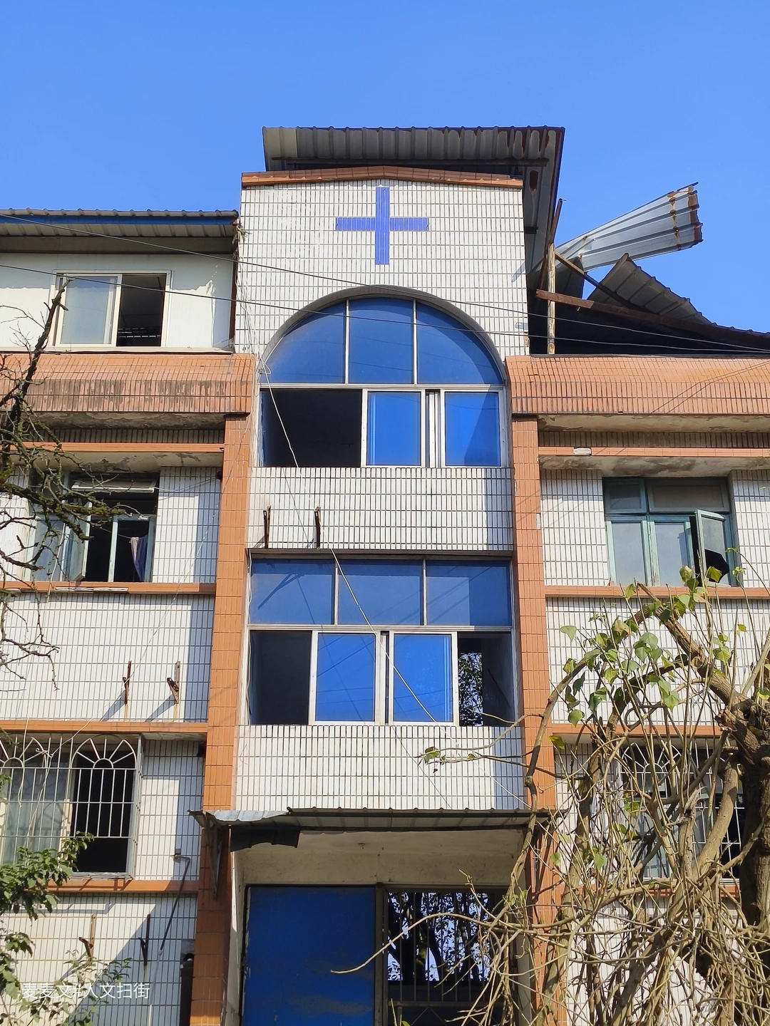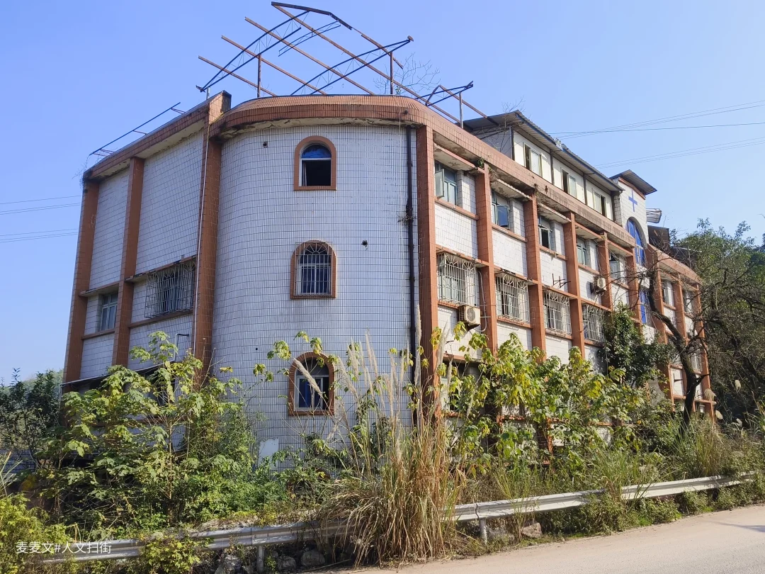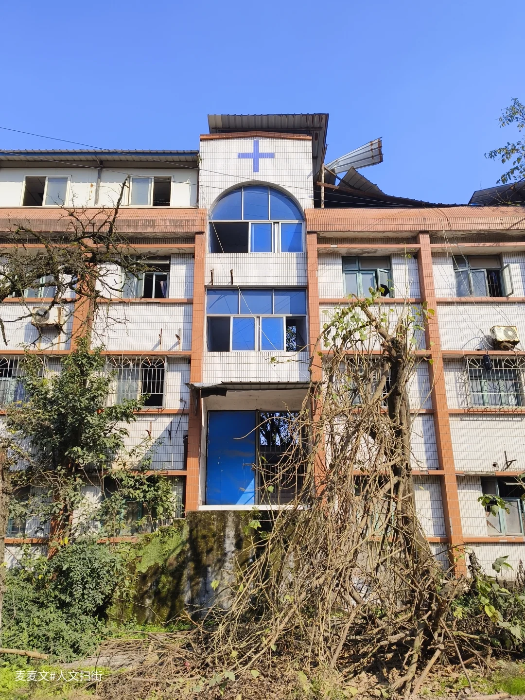 在重庆市两江新区悦来街道狮子口大桥旁,撞见重庆江合煤化集团医院的老楼。千禧年的建筑风格还刻在砖缝里,白瓷砖墙面配着红棕色砖饰,是那个年代最常见的审美。而弧形的蓝色玻璃窗却成了点睛之笔,在晴天下映着天空的蓝,和斑驳的墙体形成温柔的反差。 十字标识还嵌在墙面正上方,只是医院早已停摆。生锈的铁门、疯长的草木裹着台阶,窗棂的铁网蒙了尘,可那抹蓝窗依旧鲜亮,像把千禧年的阳光和矿上的烟火气,都封存在了这座原江合煤矿的废弃医院里。