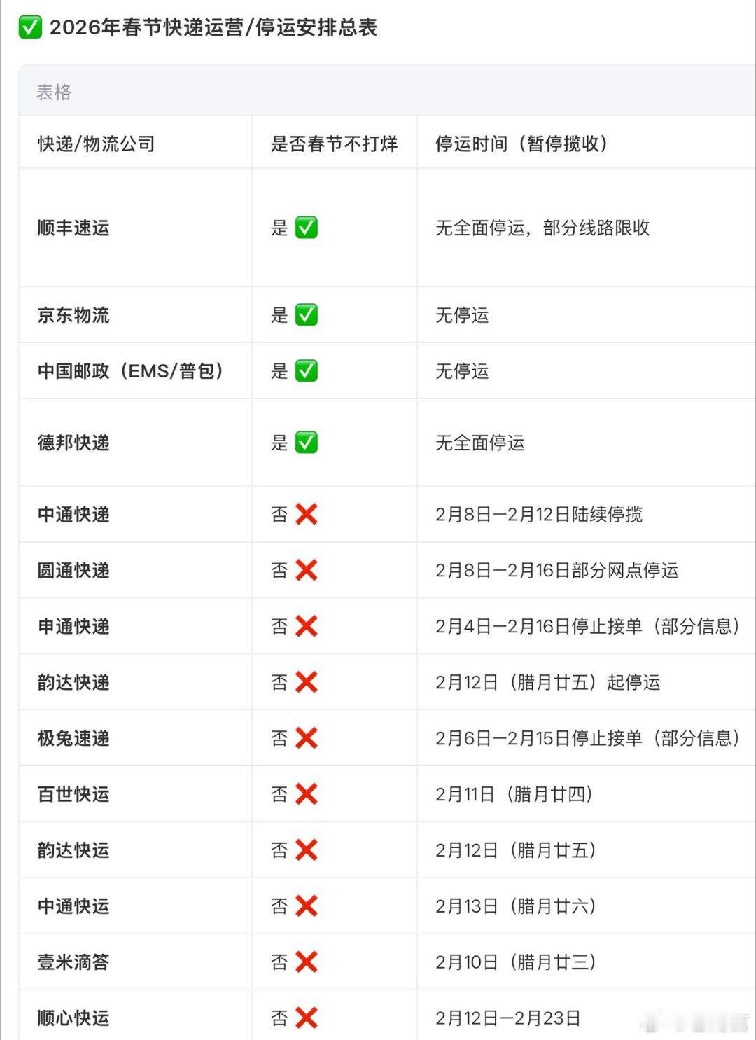 快递停运2026年春节期间,只有部分快递停运,像顺丰,京东,邮政都不停运的其他停运的快递,正月初八(2月24日)基本都能恢复正常收发快递了