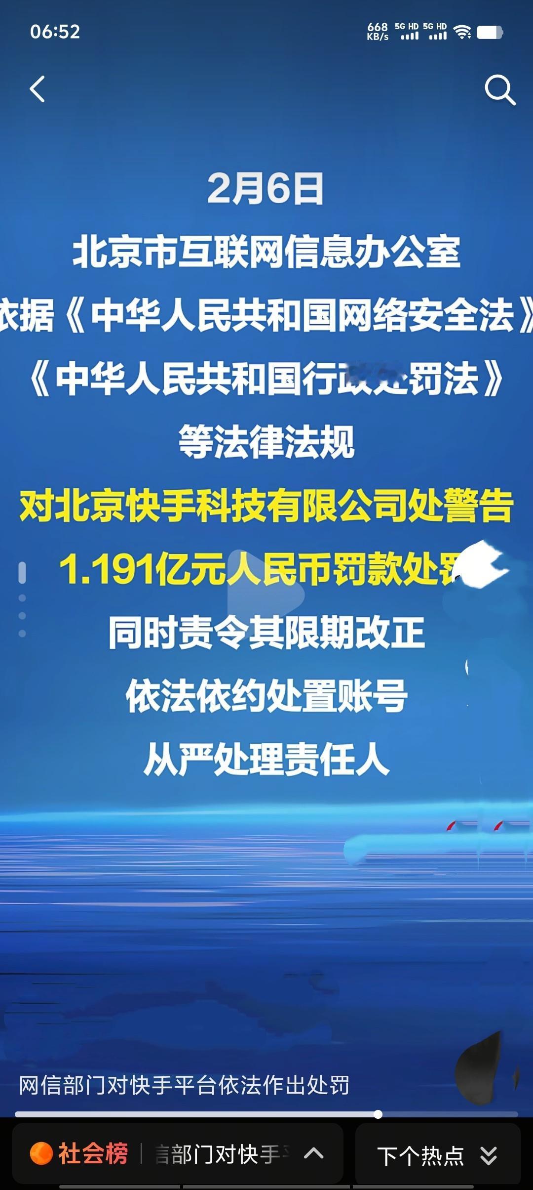 2026年2月6日,北京市网信办依法对快手平台作出处罚。经查,其存在大量色情低俗内容直播,未履行网络安全保护义务,未及时处置违法信息。依据相关法律,对其处警告、1.191亿元罚款,并责令限期整改、处置账号、处理责任人。快手平台