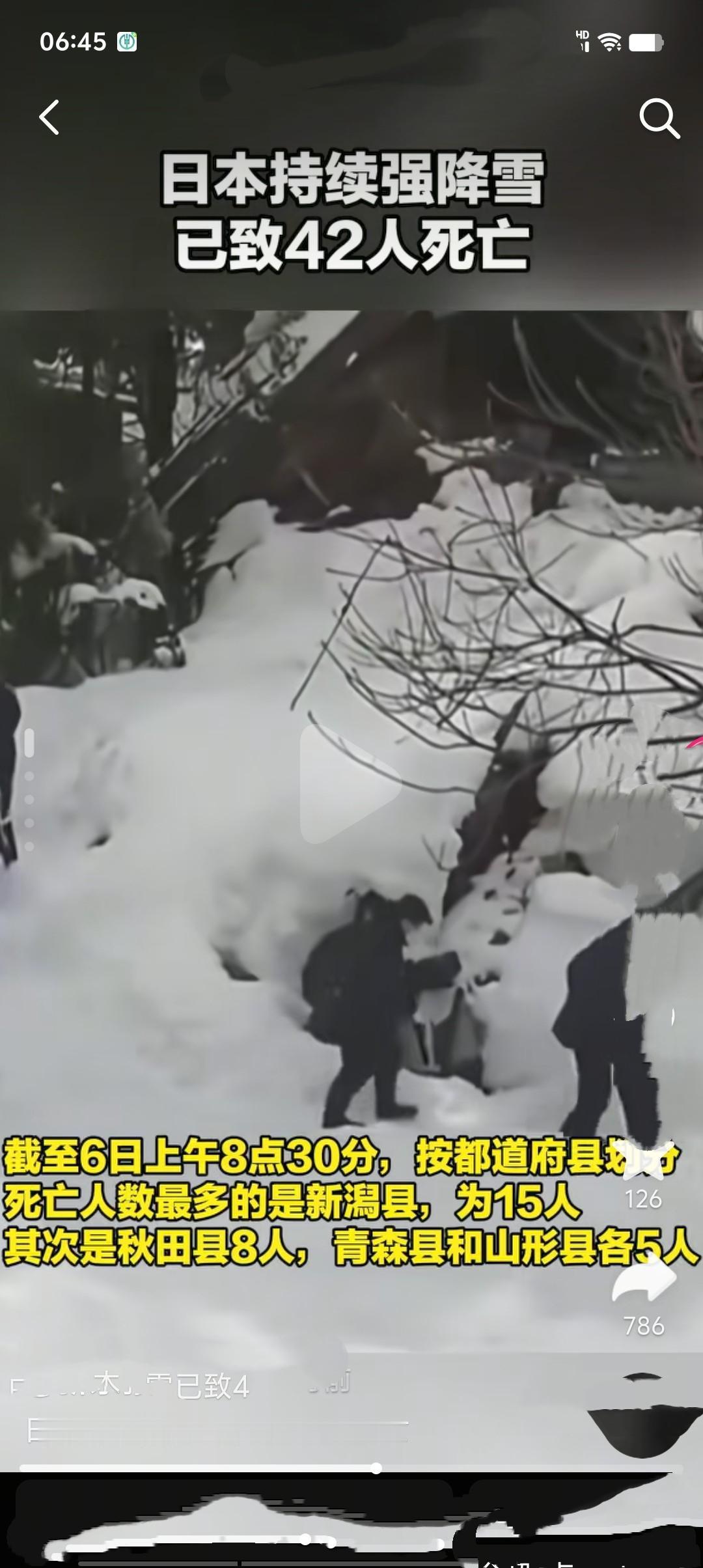 截至2026年2月6日,日本自1月20日以来的持续强降雪已造成42人死亡,新潟县死亡人数最多达15人,秋田县、青森县和山形县也有多人遇难。多地积雪超往年同期6倍,部分房屋被压塌,交通瘫痪,政府呼吁民众除雪时务必注意安全。北海道暴雪