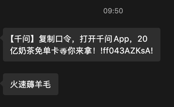 郑钦文喊你上千问AI一句话下单现在下个千问就能领25块免单卡,i人今天彻底破功,为了拉人多拿一张25元免单卡,狠狠e了一把,到处在小区群、业主群、公司群里面混迹,发邀请。发完我自己都觉得陌生,但群里立刻有人回真的假的,那一刻我突然理解了什么叫社交的尽头是薅羊毛。只要下载就有免单卡,拉人还能再来一张,这个羊毛谁不想要啊,千问免单这个活动请一直持续好吗?