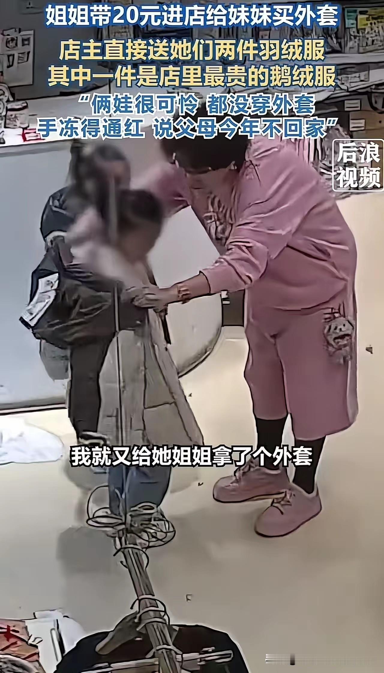 真的太好哭了!懂事的姐姐、心软的老板娘,这才是寒冬里最暖的年味🔥 事件完整版 天津一家童装店,临近春节,6岁姐姐牵着妹妹进店,攥着自己攒了很久的20多块零钱,小声说:想给妹妹买件外套,爸妈今年不回家过年。 姐妹俩穿得很单薄,小手冻得通红,姐姐只想着妹妹,完全没提自己。老板娘李女士看在眼里、心疼不已,当场: - 给妹妹选了厚羽绒服 - 又把要走的姐妹叫回,给姐姐也送一件更暖的鹅绒服 - 附赠保暖手套 - 把20多块钱塞回姐姐手里 两件衣服成本超1000元,老板娘说:我也是当妈的,见不得孩子挨冻。 临走时,小小的姐姐郑重给老板娘深深鞠躬,这一幕戳中无数人。 姐姐的懂事让人心疼,老板娘的善良自带光芒。这不是炒作,是普通人最真诚的温柔,必须让她火! 素材来源于网络