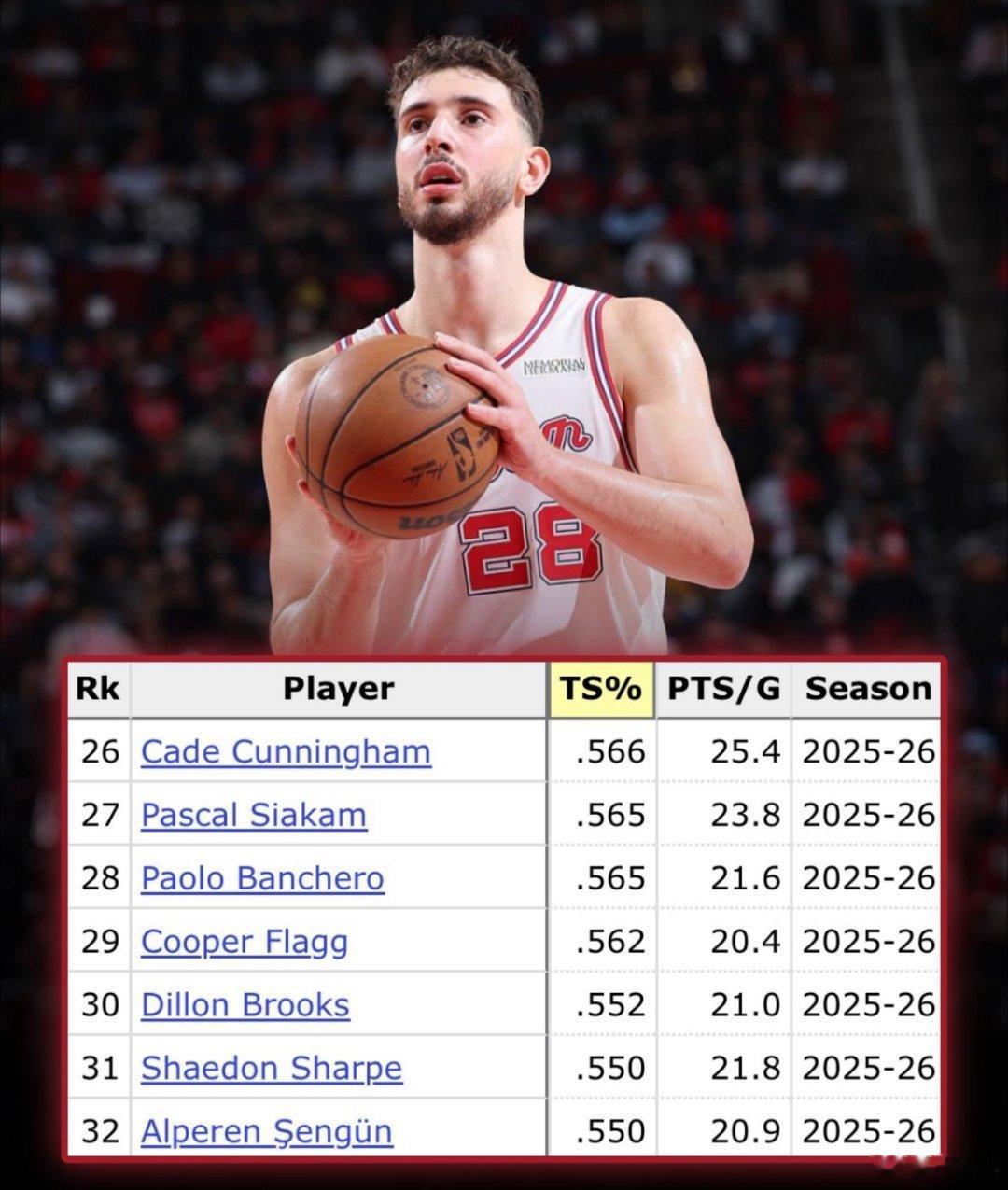 联盟 32 名场均 20 分以上的球员中,申京目前的 真实命中率(TS%)是倒数第一(55.0%)。