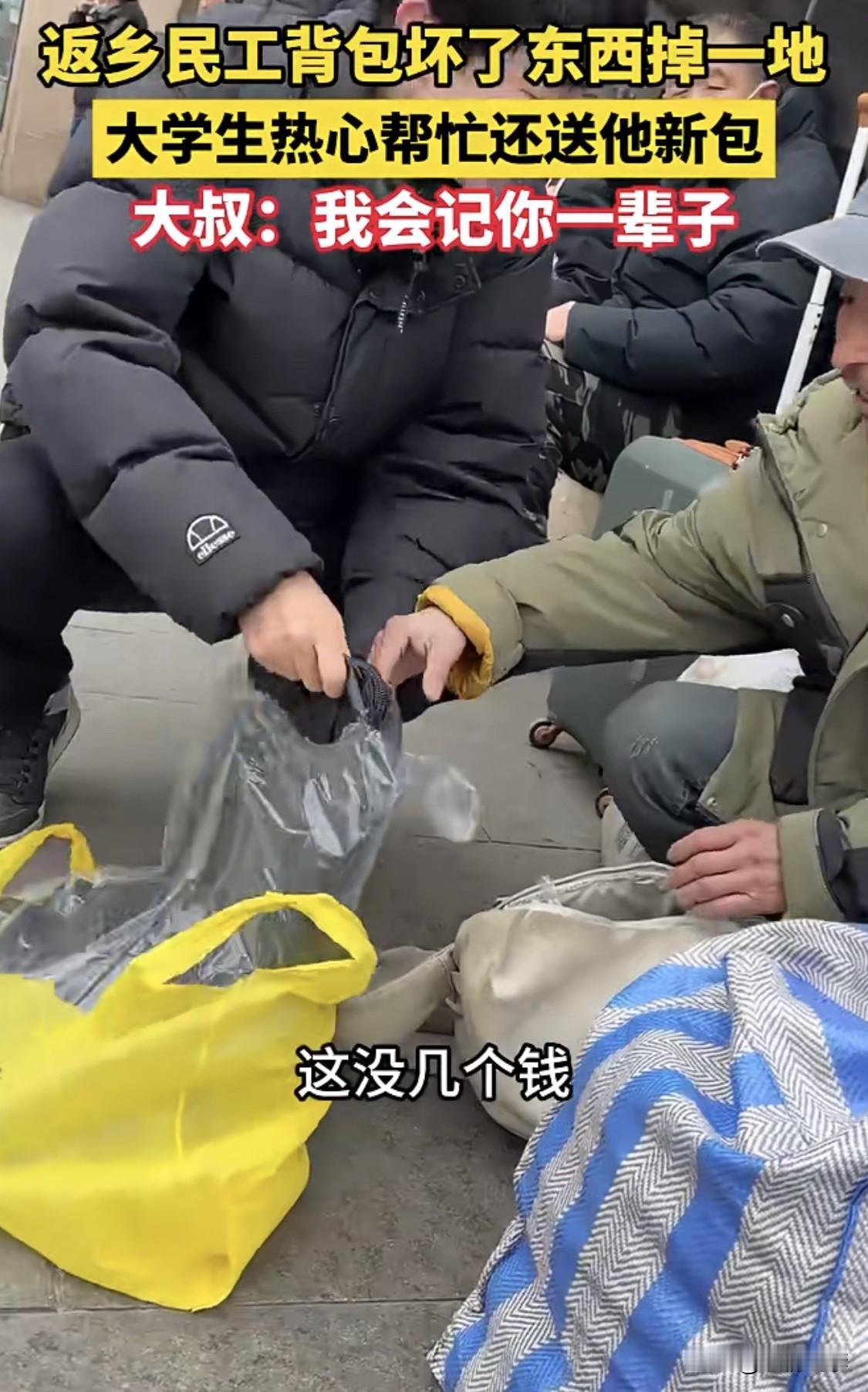 必须找到这个大学生给他表扬一下!太暖心了! 今日正是返乡高峰,一位在外打工的大叔拖着大包小包准备坐车,没想到一个包突然坏了,东西漏了出来。广场上一位男大学生看见了这一幕,赶紧喊大叔,提醒他东西掉了。 大叔赶紧停下来看他那个破了的包,用牙咬拉链,男生笑着让大叔别修了,别把牙咬坏了。然后男生马上用手机给大叔买了一个新包,大叔一看就是很不善言辞的好人,问男生多少钱、要把钱给他,男生笑着说:“这没多少钱,什么钱不钱的。” 大叔非常感动,可能他也没有想到,在他乡异地,他还能遇到如此温暖的孩子帮他并且不求回报,质朴的大叔说:“我肯定会记你一辈子。” 大叔真的会记住这个孩子一辈子的,我相信。甚至这个包他到了家都舍不得再用,每当看到这个包,他都会想起自己曾经遇到的这个温暖的孩子。 这一幕看的人泪目了,太温暖了,这是谁家的孩子怎么这么好!刻在骨子里的善良,从来都不是来自表面,一看就是家庭充满温暖的孩子,知书达理,内心阳光,非常有共情力还乐于助人。 希望这样的善举能被更多人看到,这个孩子的学校不知道是否看到了,一定要表扬这个孩子。做好事不论大小,他值得被表扬👍祝愿这个孩子以后的道路一路生花,事业顺遂,身体健康,一生平安!