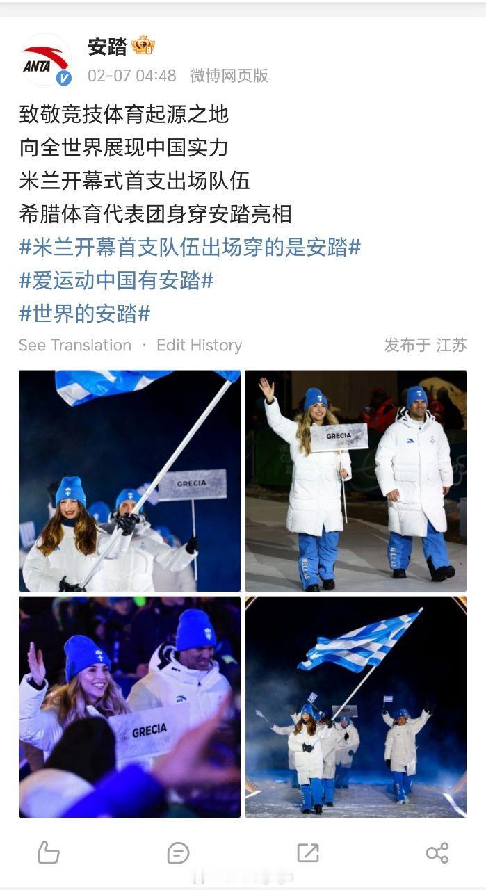 按照奥运会传承已久的惯例,作为现代奥林匹克运动发源地的希腊代表团,始终享有开幕式率先入场的殊荣,北京时间2月7日凌晨,米兰-科尔蒂纳冬奥会开幕式盛大启幕,希腊代表团作为首支登场的队伍,其身着的全套装备均由中国品牌安踏打造。