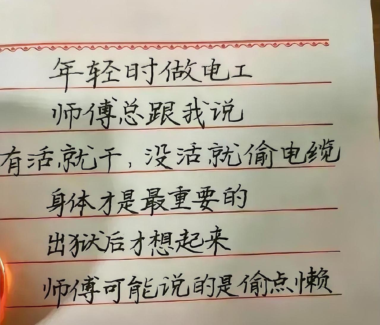说什么报答之恩,不供出为师就好。英雄不问出处,电缆不问来路?电工不偷铜,注定一世穷?师傅领进门,判刑看个人。都是方言惹的祸,以后找个普通话甲级一等的师傅。被抓时举报你师傅,他去了你就清楚了!是说话不清还是听话不清差了这么多。你师傅好意让你别太累,谁知却害了你。如果菩提老祖在你头上敲三下,第二天你就去敲人闷棍发财了。