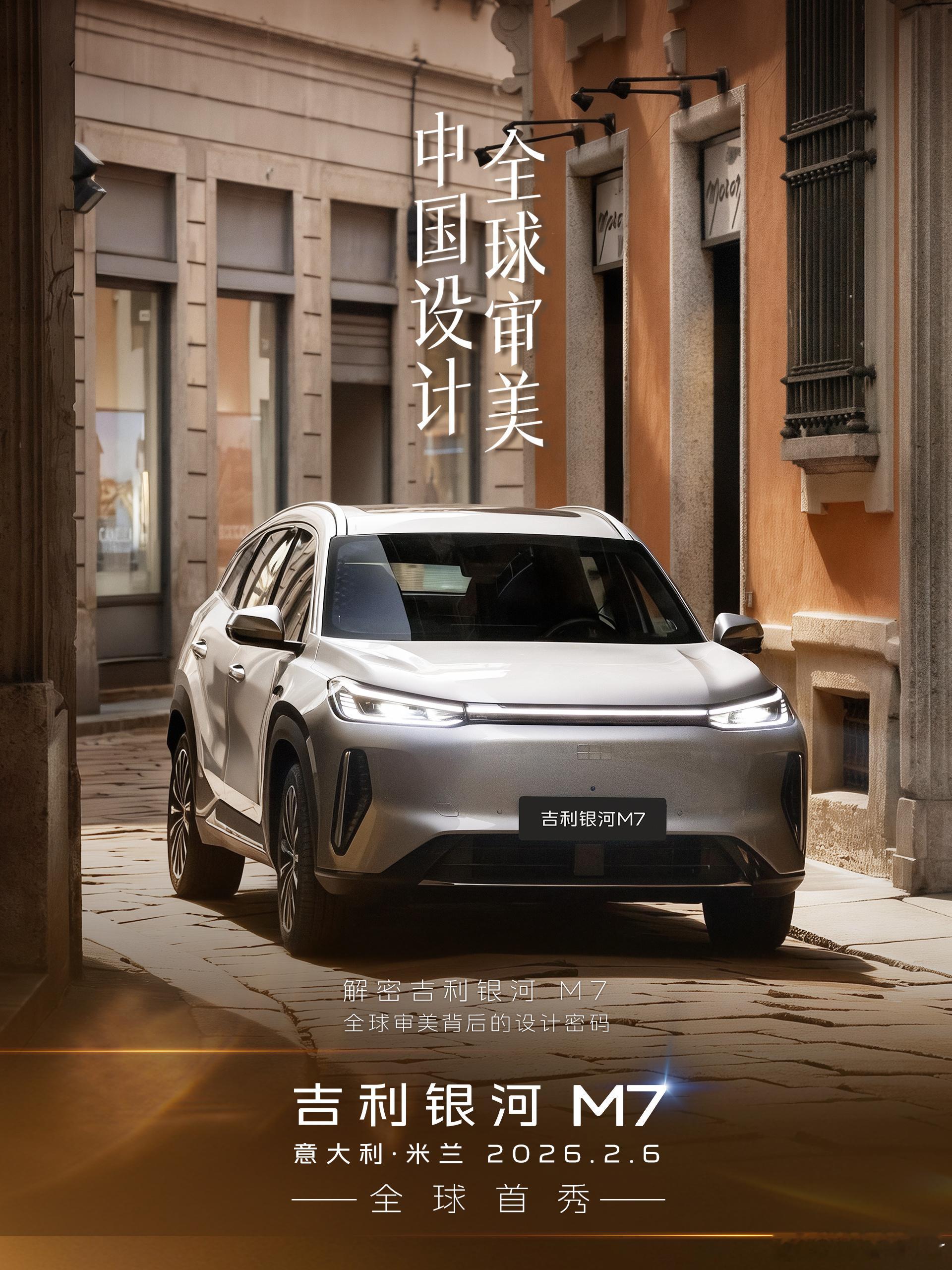 吉利银河m7全球首秀 银河M7定位是中级SUV,今年终于不全是大车了外观融合中式审美,加上溜背造型,增加运动感目前得知纯电续航225km,综合续航1730km预计是今年上半年上市