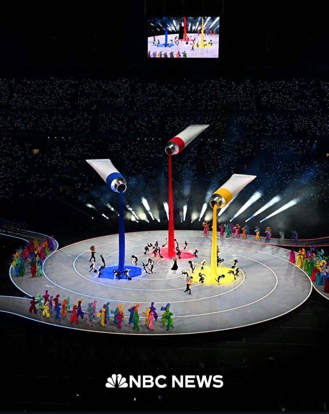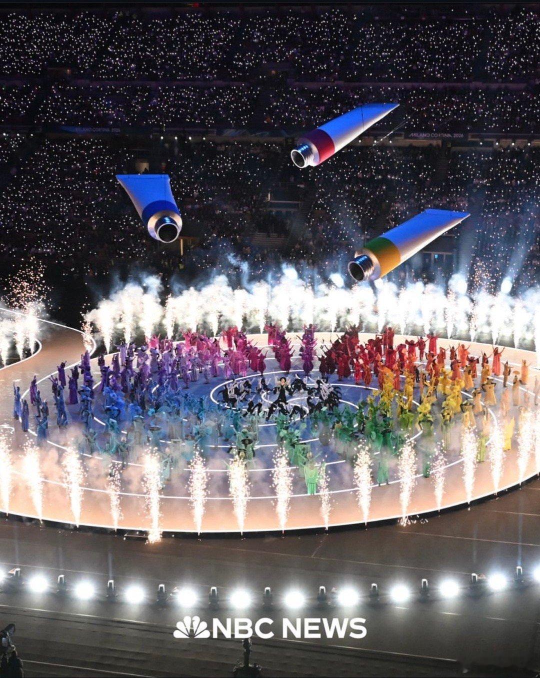 米兰冬奥会开幕式 冬奥开幕式,除了火炬视觉灵感源自达·芬奇手稿中的几何绳结(Knots)图案,给人印象最深刻的另外两个设计,都和高科技没什么关系。一个是模拟颜料管流淌出颜料,一个是自嘲兼普及意大利人的各种手势。