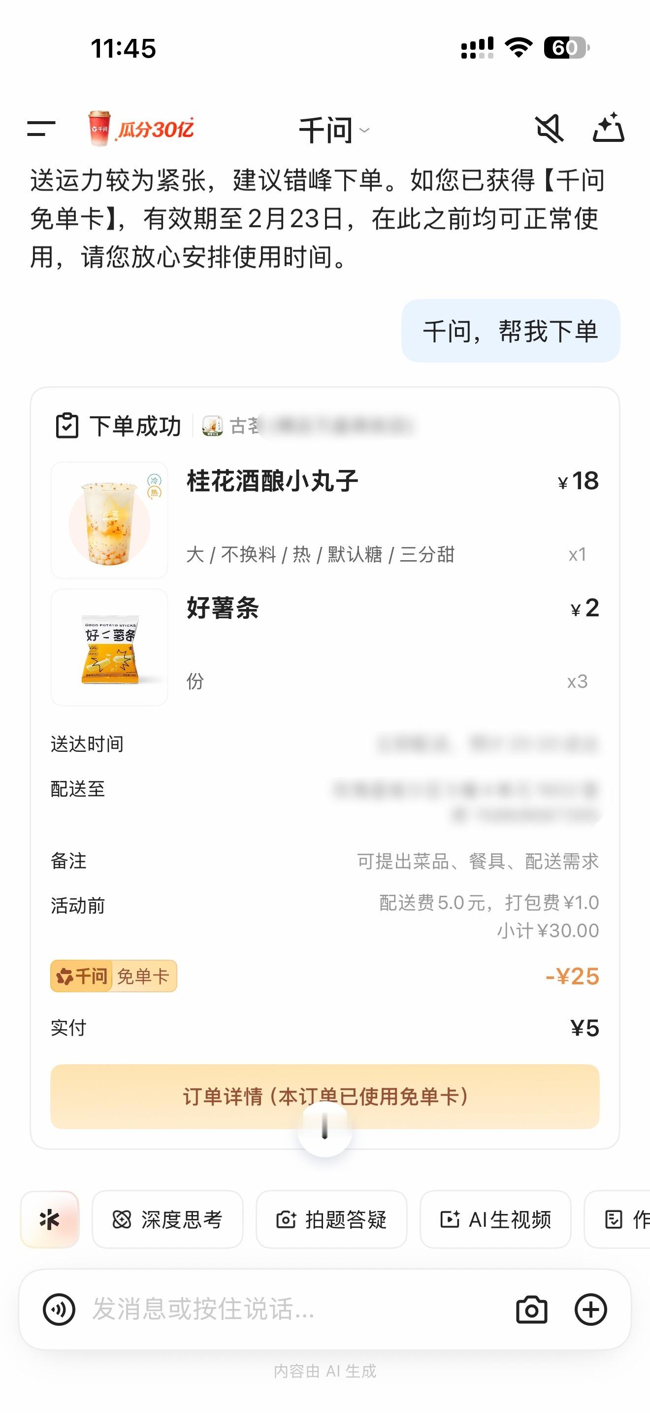 千问也是喝上免费奶茶了,但是现在好像是送餐高峰期,配送费要5块