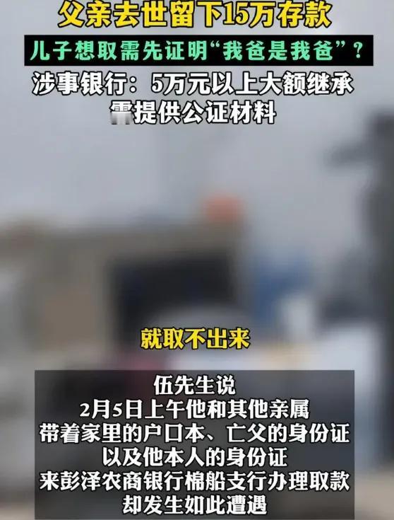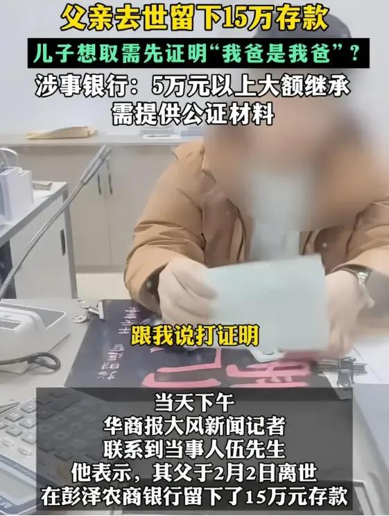 有够闹心!父亲遗体在殡仪馆等钱火化,儿子手握火化证,户口本却取不出15万遗产。江西伍先生的遭遇冲上热搜,为“证明我爸是我爸”的荒诞现实再一次上演。 银行咬死超5万必须公证的规定,却忘了伍家连公证费都要东拼西凑。更讽刺的是,同一家银行城里网点悄悄放宽政策,农村支行却死守规矩,新员工连制服都没穿齐。这哪是政策问题?分明是执行的双标! 网友分成两派。一派力挺银行,今天让你取了,明天兄弟姐妹闹上门谁负责?另一派怒怼僵化,户口本和火化证都证明不了关系,难道公证书是神仙开的? 政策从1万免公证提高到5万本是进步,但农村银行宽限期拖到2025年底,导致2026年的伍先生成了政策夹心层。制度本该便民,如今却逼人借债办公证。死人等钱下葬,活人被证卡脖。 现在伍先生已取到钱,但全国还有多少家庭正经历同样煎熬?若公证费超过存款10%,这钱你还取吗?政策落地少点冷冰,多掂量人间急难吧!