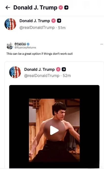 特朗普昨天转发的两个意义不明的帖子都有后续,一个是转发李小龙电影精武门踢馆视频,第二个是转发了一个把奥巴马夫妇的脸贴到猴子身上的视频。 李小龙那个,特朗普转发后,有个人评了一句:如果事情没解决,这是一个好选择。这句话立刻被特朗普二次转发了。 把奥巴马夫妇猴子那个引发了巨大争议,被骂种族歧视,不少共和党的人都在骂他。目前,这一条被删了。但特朗普又发了一条说:绝不会为这件事道歉。