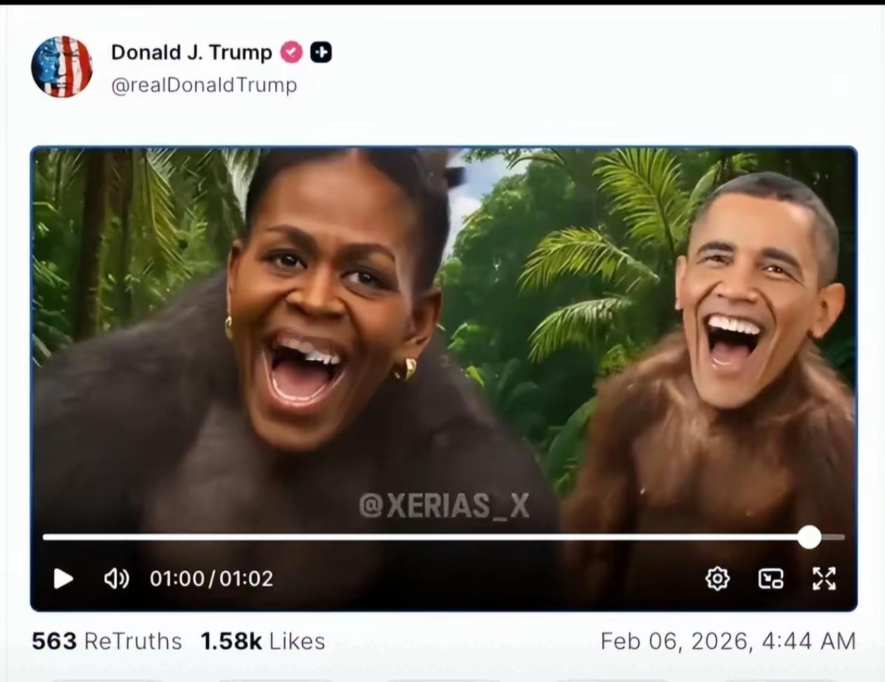 也就特朗普敢这么做,可以这么玩!他深夜发视频:把奥巴马夫妇P成猿猴,引发种族主义指控。