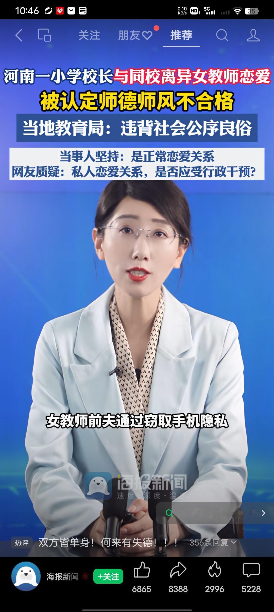 近日,河南一小学校长与同校离异女教师恋爱,被认定师风师德不合格引起网友热议! 小学校长与离异女教师恋爱被认定师德不合格,涉事校长陈先生称:自己2023年离婚后与同校的离异女教师恋爱,因为工作原因没有公开,女教师的前夫通过窃取手机隐私得知此事后在网上公开不实信息,已被警方刑事拘留。 然而教育局后续认定陈校长“违背社会公序良德”,给予党内警告处分并调离原校,女教师也被辞退了,两人的师德考核定为不合格,导致校长岗位晋升受影响。教育局回应:纪律处分和河南省师德考核办法,该行为已违法职业道德,可直接认定不合格,当地一贯狠抓师风师德。 说实话,我对这样的处分真的想不通,既然都是单身又不是婚内出轨,又何来失德一说呢?再说了,女教师的前夫已经被抓了,就证明他散布的不是事实,如果男女双方有一方有家庭,那定为失德无可厚非,但是既然人家都是单身了,都已经离异再定为失德就有点过分了。 有网友说,只要不是婚内出轨,别人无权干涉人家的婚恋自由,人家都是单身了,你有什么权利干涉别人的恋爱呢,难道老师离异就不能再婚再恋爱了吗?感觉教育局这次是不是有点管的宽了?还有网友说这是 被别人穿小鞋了吧,是别人盯上了他要高升的位置了。