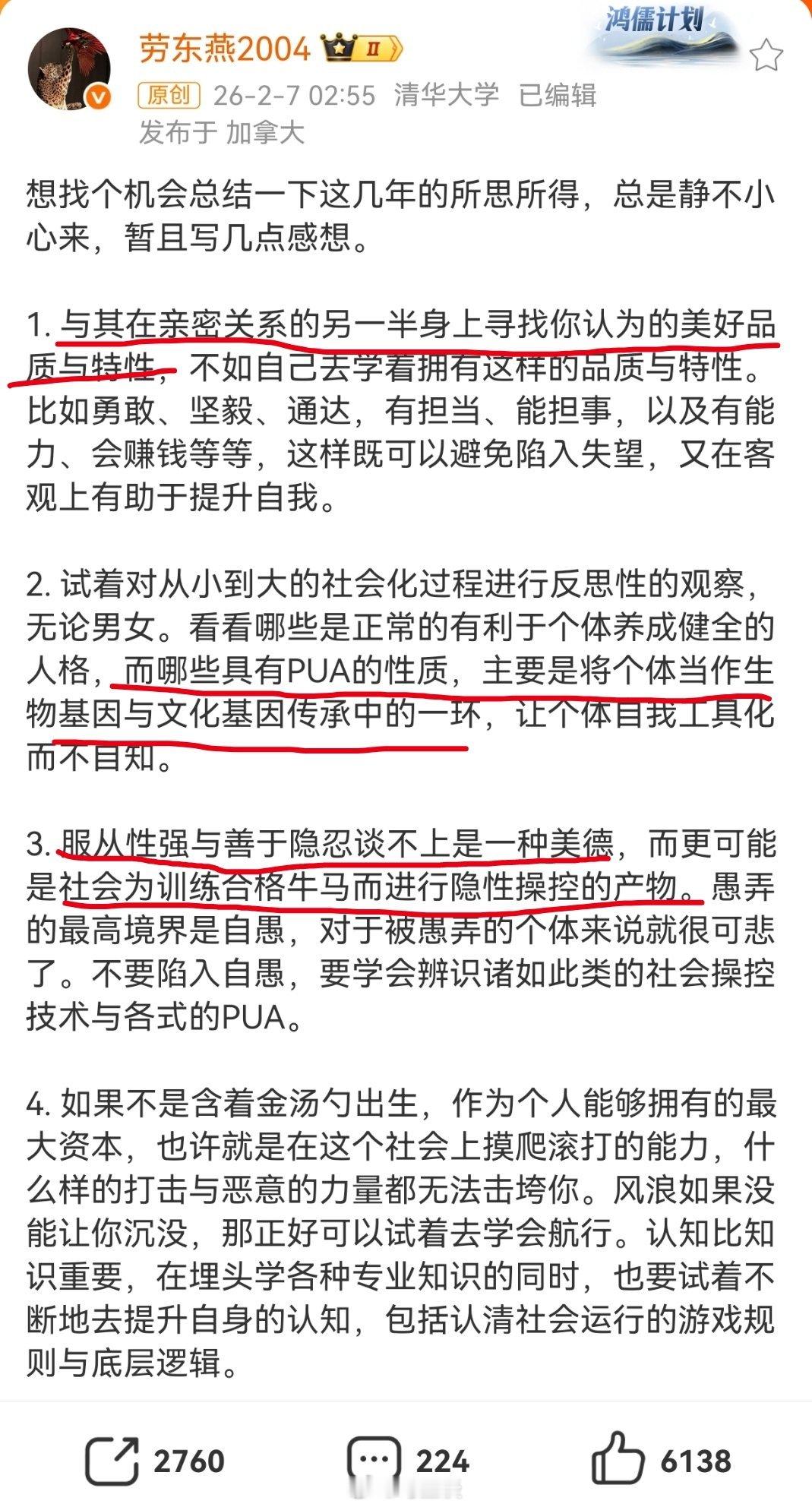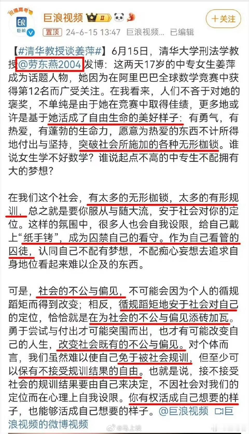 清华大学法学教授劳东燕谈几年所思所得。有观点赞同,也有不认同。比如什么中年女性出走家庭、看待事件观点不同检验友情…我就不认同。整体来看,全文还是和劳教授以往的风格一样,情绪输出较多,逻辑思辨较少,比如支持姜萍那次。作为个人,其实这无伤大雅,甚至还能成为成长的动力。只是,如果作为我国顶层法律学者学,不善思辨反而频繁情绪输出,那法律界可能就会遇到各种问题和麻烦了。